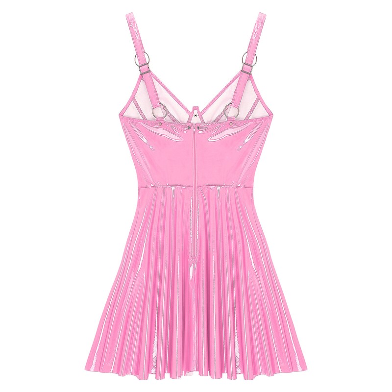 Women Wet Look Shiny Mini Club Dress Patent Leather Halter Backless Skater Dress