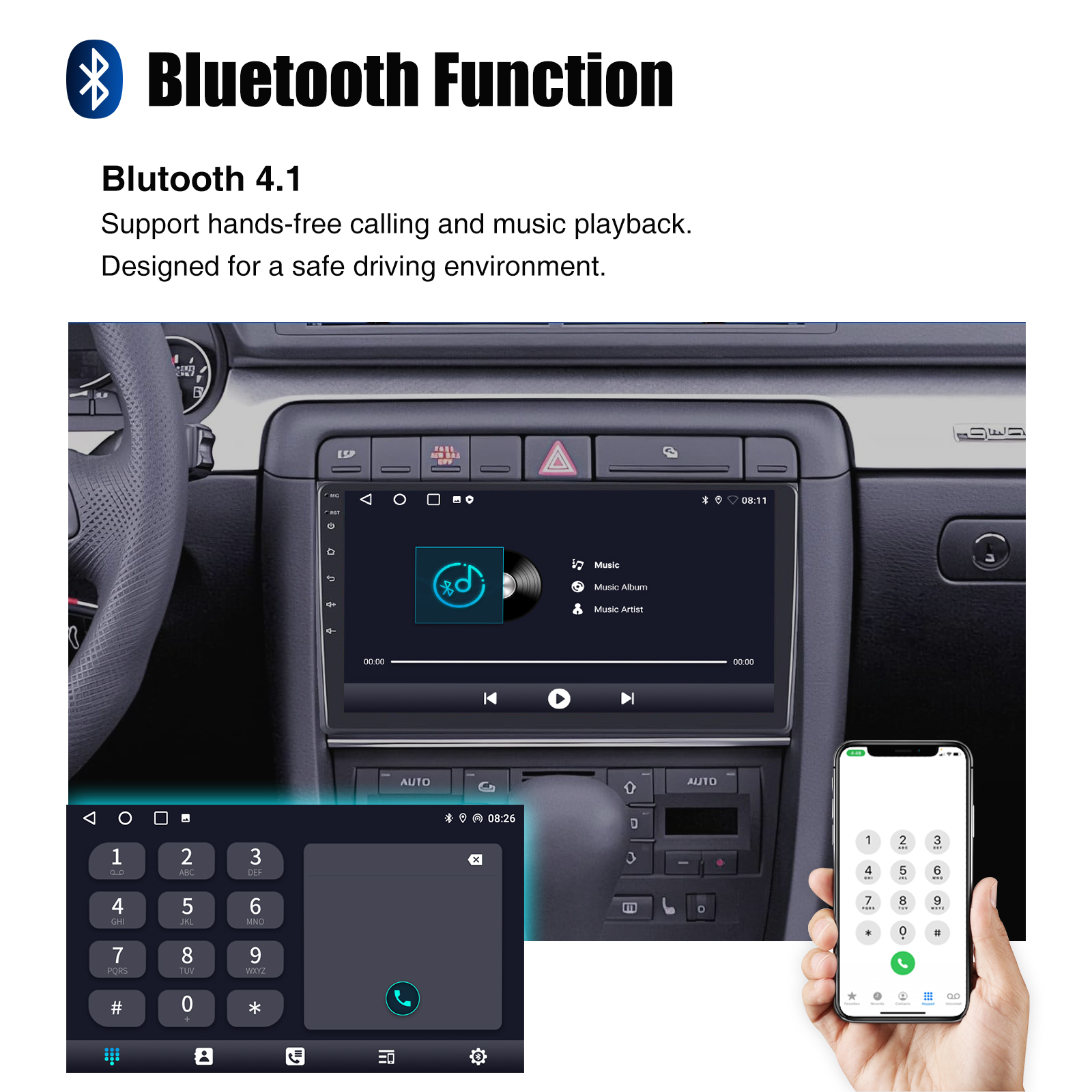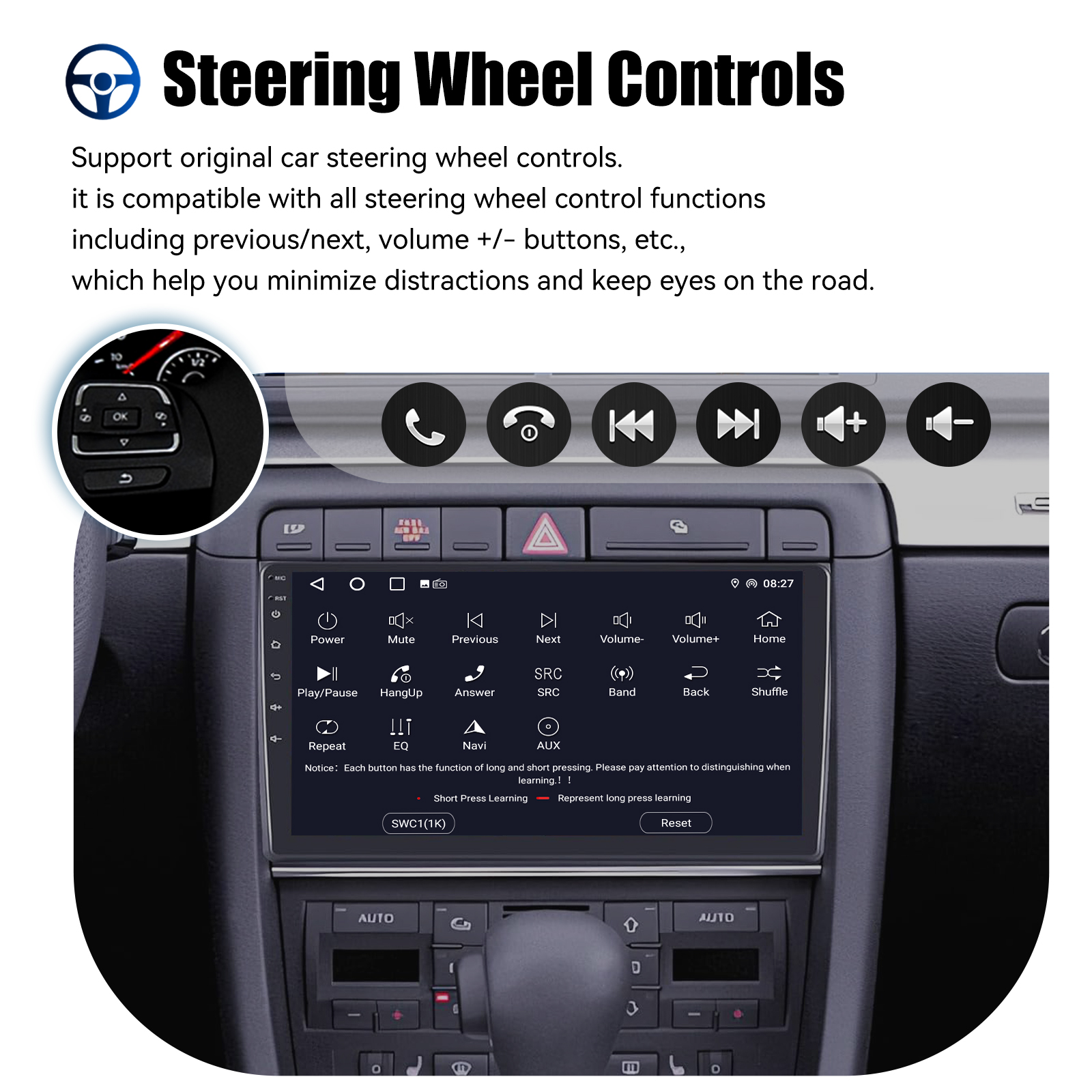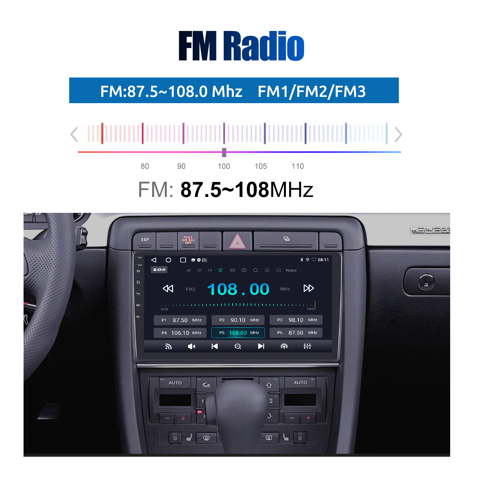 9 Inch Android 13 Car Radio Audio A4: The Android car radio with 9" 1280* 720 HD IPS capacitive touchscreen, 4GB RAM and 64GB ROM allows you to download your favorite apps and videos, so driving is no longer boring. No extra frame, no cable change, plug and play. It comes with Canbus and supports most of the original functions: steering wheel control, reverse signals and reading original computer data, etc.