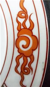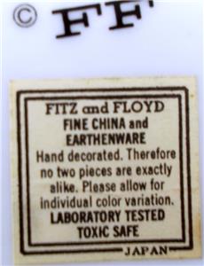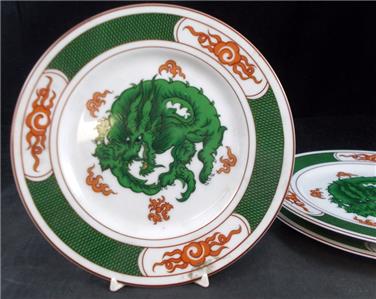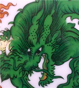 This attractive pattern was produced by Fitz & Floyd and is now discontinued. It features a green dragon design on white with orange fire and trim.