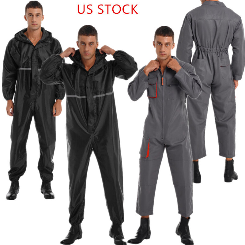 US Men Coverall Long Sleeve Jumpsuit Front Half Zipper Hooded Mechanic Workwear