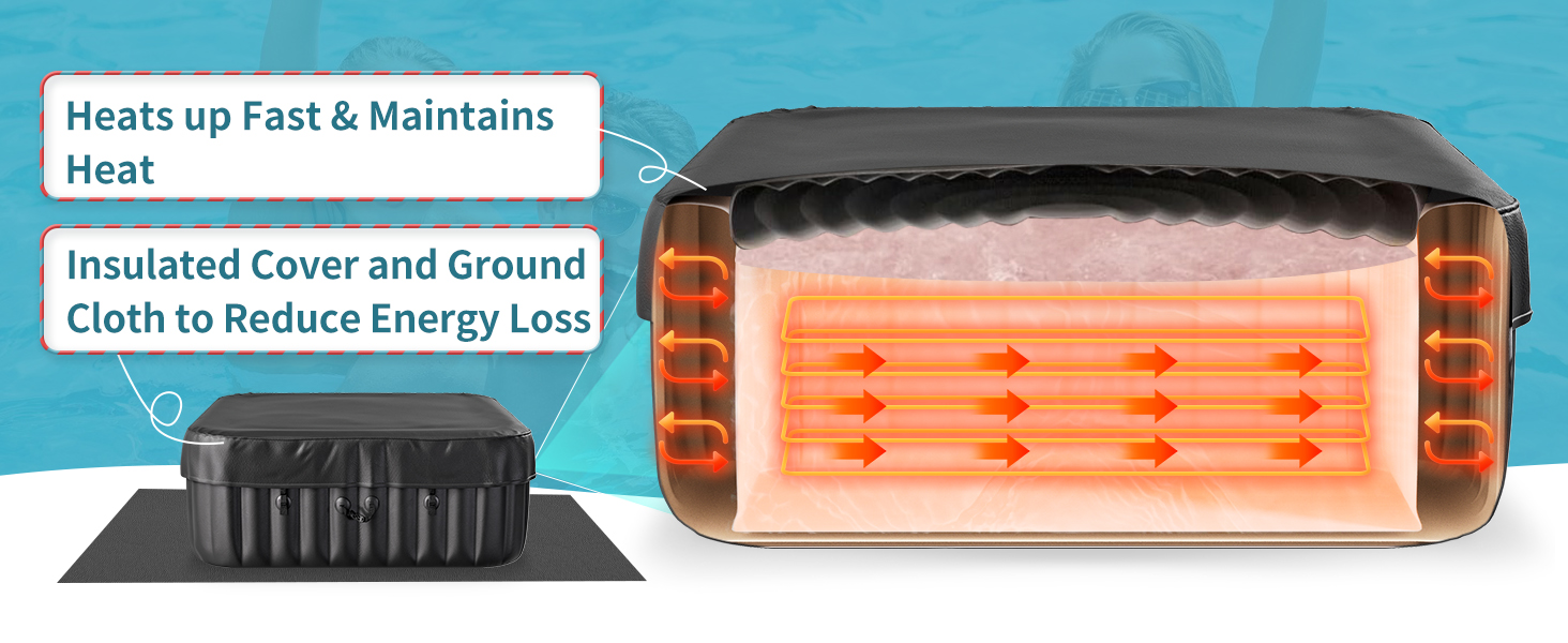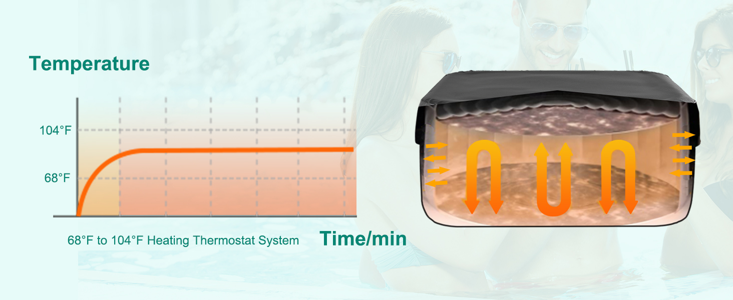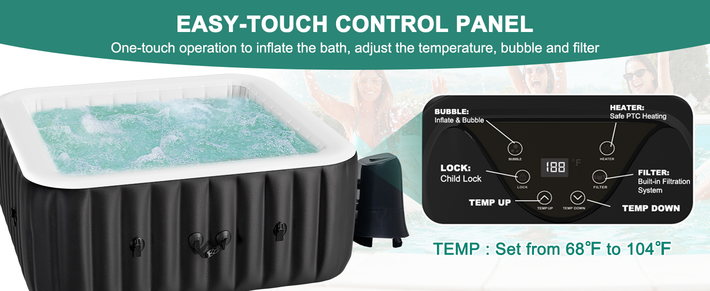 【QUICK INFLATION AND RAPID HEATING】The portable hot tub has a pump that quickly inflates the spa, heats it up, runs filtration. The digital panel can also adjust the filtration and heating system not only heats the water quickly up to 104 degrees but keeps the water temp and circulation automatically. The Heater's, Power: 1350w Power Cord: 5.2m (204 inches), Water temperature range: 68℉–104℉/20℃-40℃.