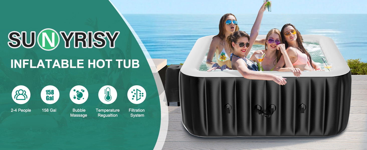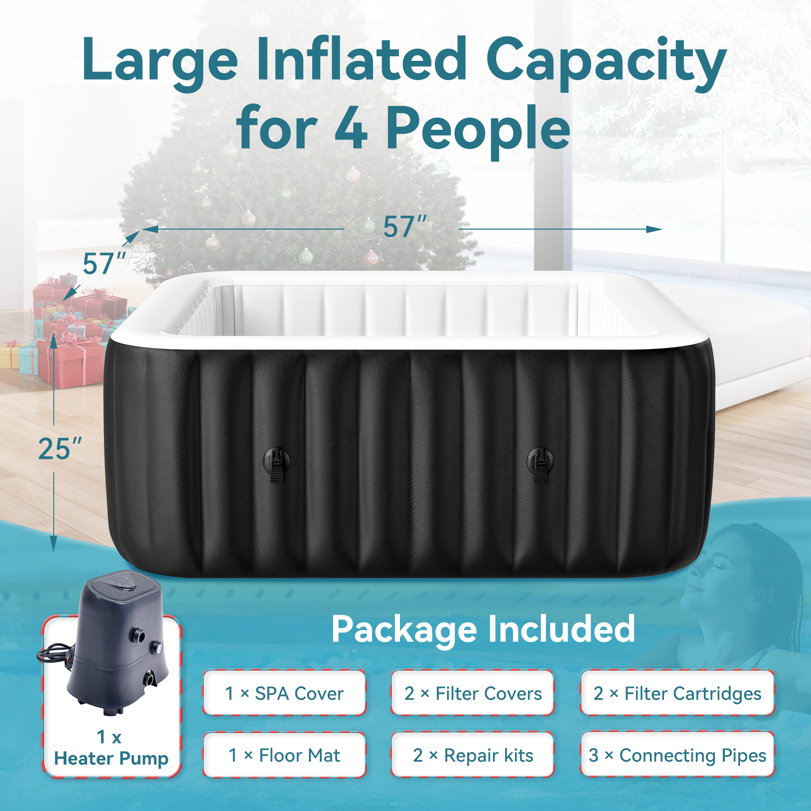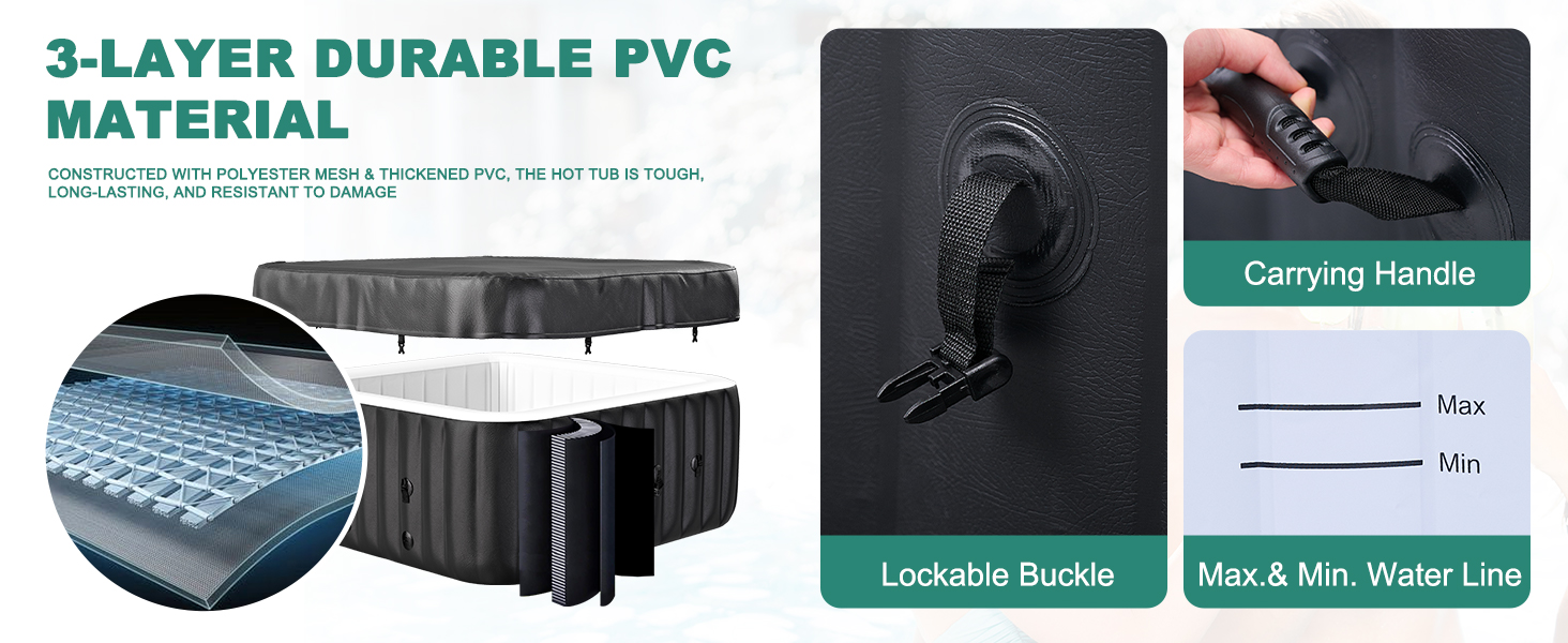 【IDEAL FOR 4 PERSON】Dimension: 57"L x 57"W x 25"H massage with 120 surrounding air jets. The puncture-resistant tri-tech material and I-beam construction ensures your hot tub never loses its shape and stability even when people sit on the side walls. WATER MUST BE LOCATED BETWEEN MAX AND MIN WATERLINES. IF LOWER THAN THE MIN LINE, THEN IT CAN'T HEAT.
