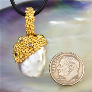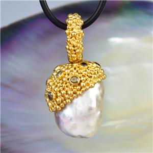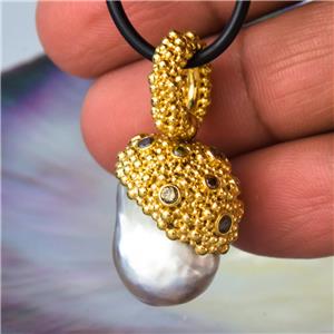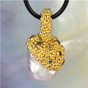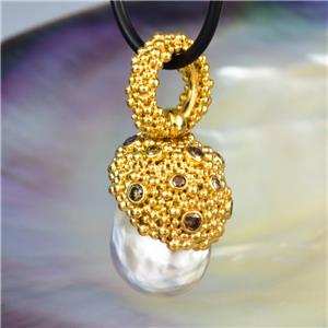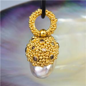 A gigantic genuine SOUTH SEA PEARL PENDANT with Gold Vermeil over solid Sterling Silver Bali granulation work and genuine natural DIAMOND gemstones