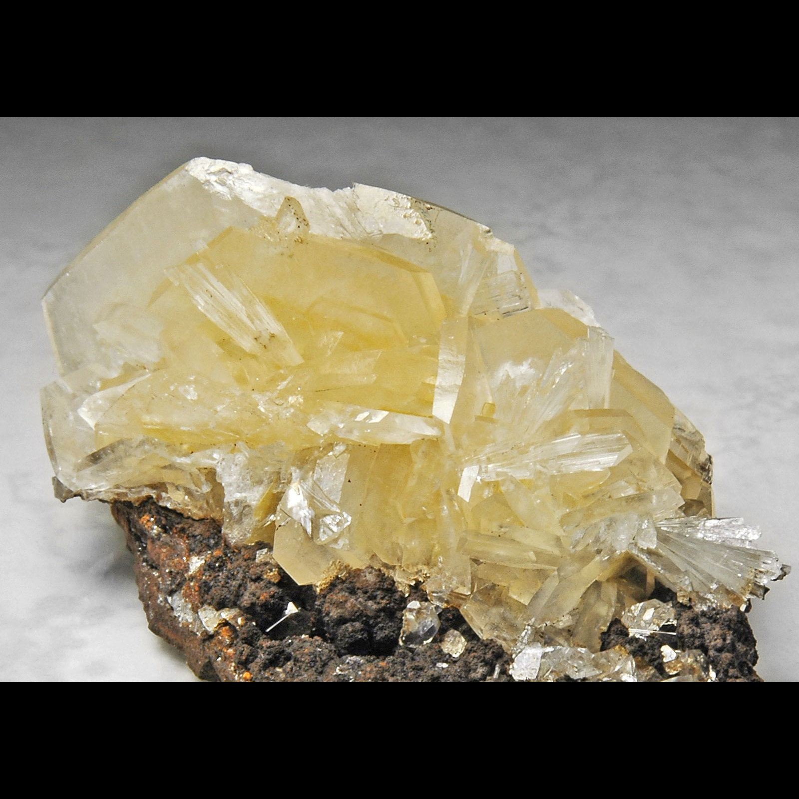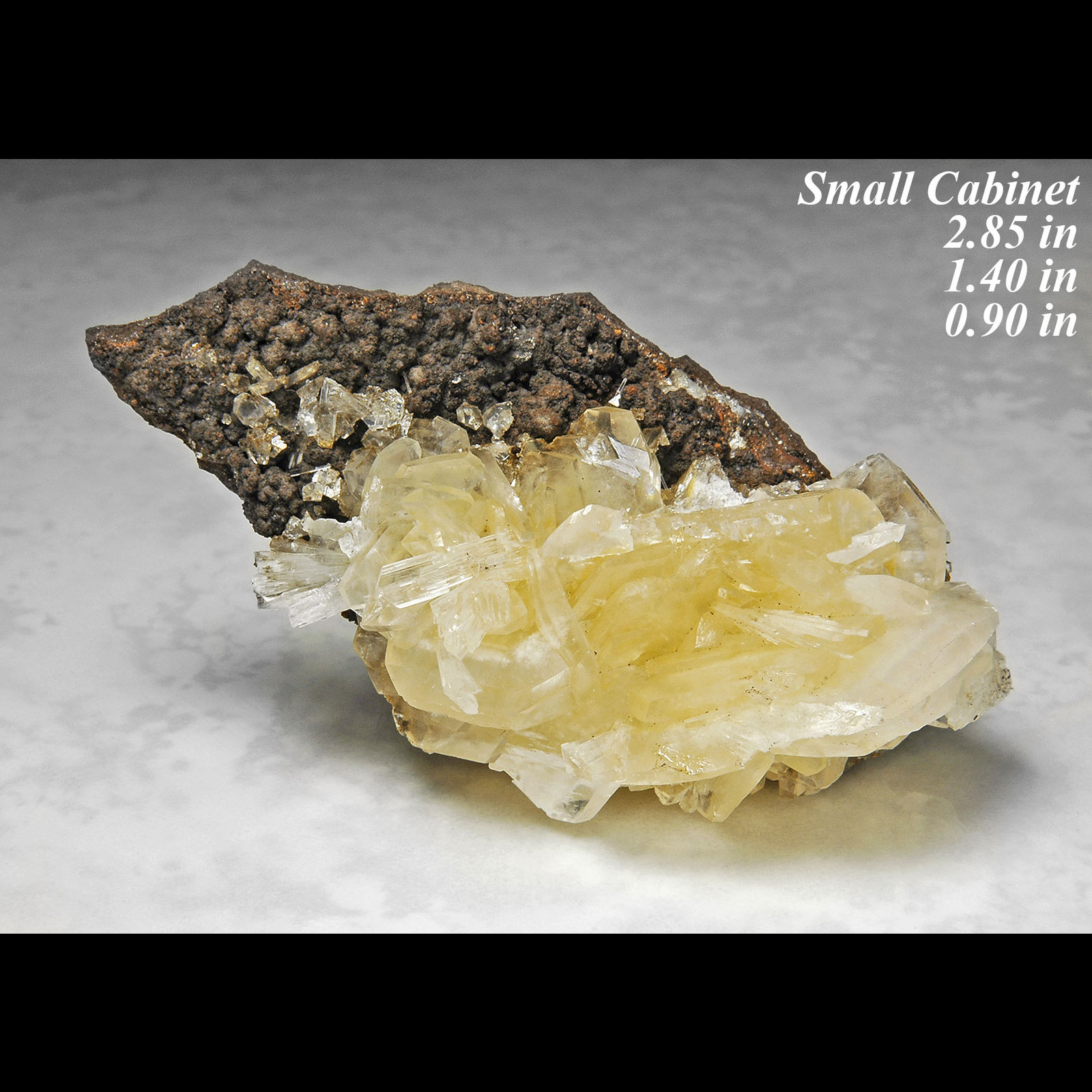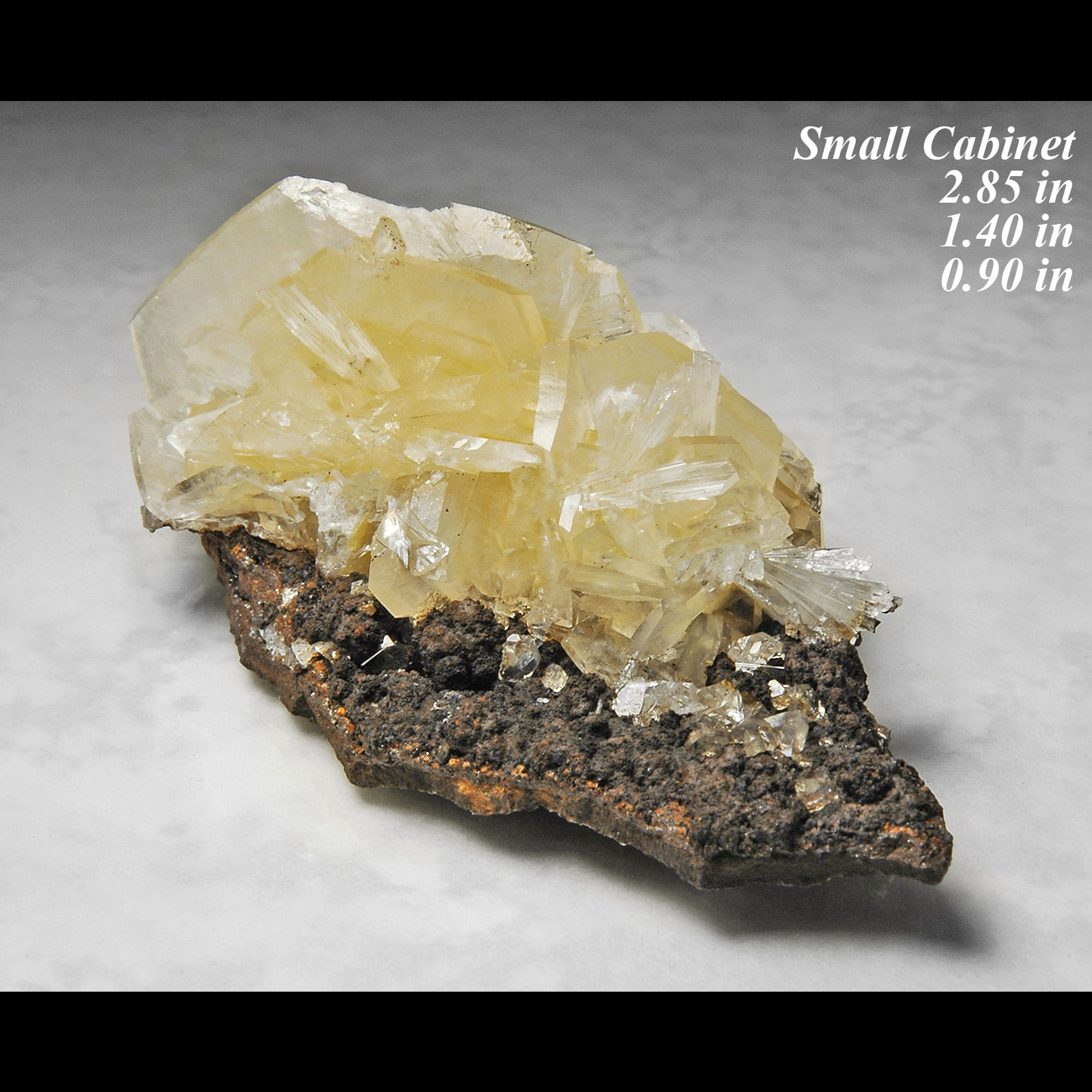 Yellowish Colored Platy Calcite & Hemimorphite - Location: Santa Eulalia Chihuahua Mexico. Small Cabinet (see photo for more details). Here we have something that is relatively new and very aesthetic; we have a matrix specimen with light yellowish colored platy calcite crystals along with gemmy colorless bladed hemimorphite crystals. These calcite/hemimorphite specimens have a limited availability. The calcite crystals are well formed and sharp tabular platy crystals and are somewhat color zoned and have a light yellow color (in areas) to almost colorless in other areas. The hemimorphite crystals are also well formed and sharp and form as gemmy colorless bladed crystals and have a bright glassy luster.