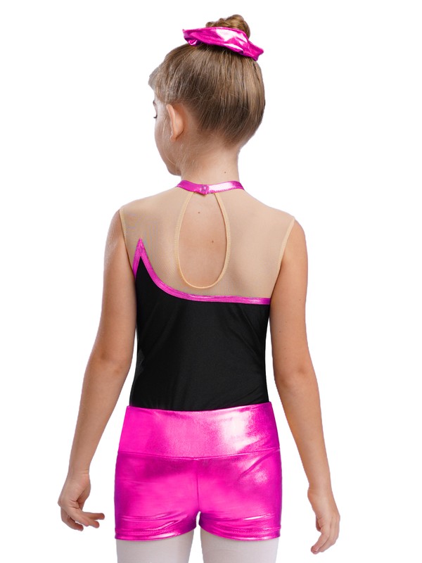 Metallic stripes and sheer mesh patchwork design brighten up any performance and make your girl stand out in the crowd.