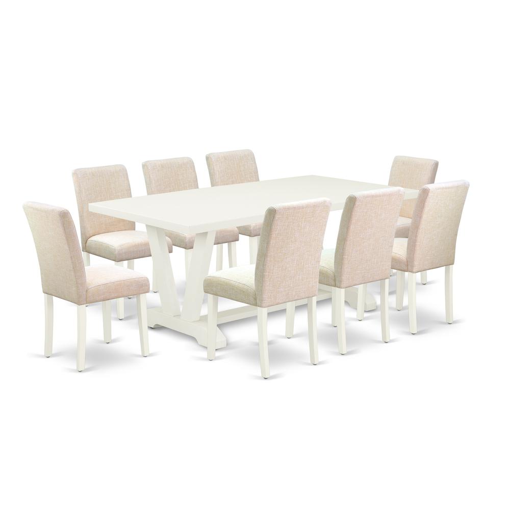 EAST WEST FURNITURE 9-PIECE KITCHEN TABLE SET 8 STUNNING DINING ROOM CHAIRS AND RECTANGULAR DINING ROOM TABLE This dining room table set includes 8 remarkable Padded Parson Chair and an incredible X-leg dining table. The modern dinette set gives a Linen White hardwood dinner table and frame and an excellent Light Beige Dining Chairs seat and high back that bring elegance to your living area and increase the charm of your amazing dining room. The high-quality of our gorgeous chairs helps our lovely customers to get relaxation and feel free when getting their meal. This dining table built from superior quality rubber wood which can bear the weight of 300 Lbs. Our parson's dining room chairs have a wooden structure with a luxury seat of high-quality foam which is covered with Linen Fabric that provides you relaxation with friends or family. This listing has a premium color of Linen White finish for dining table and Light Beige finish the parson’s chairs. Our gorgeous premium colors improve the beauty of your living area and give a magnificent look to your dining area or dining area. East West furniture usually manufactured from modern furniture along with easy assembling parts. We try to keep our furniture parts innovative as well as simple. Our high-class rectangular dining table set is best for your attractive living area as well as the kitchen. You can use it for casual home parties. Keep enjoying East West modern furniture! Features: Fabric Material: Linen Fabric Fabric Color: Light Beige Measurement of attractive small table: Length 72; Width 40; Height 30. The dimensions of wonderful dining chairs are: Length 19; Width 25; Height 41. Package Include: 8 Beautiful Dining Room Chairs and a Beautiful Dining Room Table.