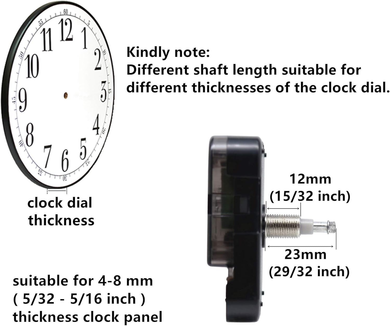 Precision Dimensions: Total shaft length of 23 mm (29/32 inch) with a thread length of 12mm (15/32 inch); perfect for clock panels ranging from 4 - 8 mm (5/32 - 5/16 inches) thick.