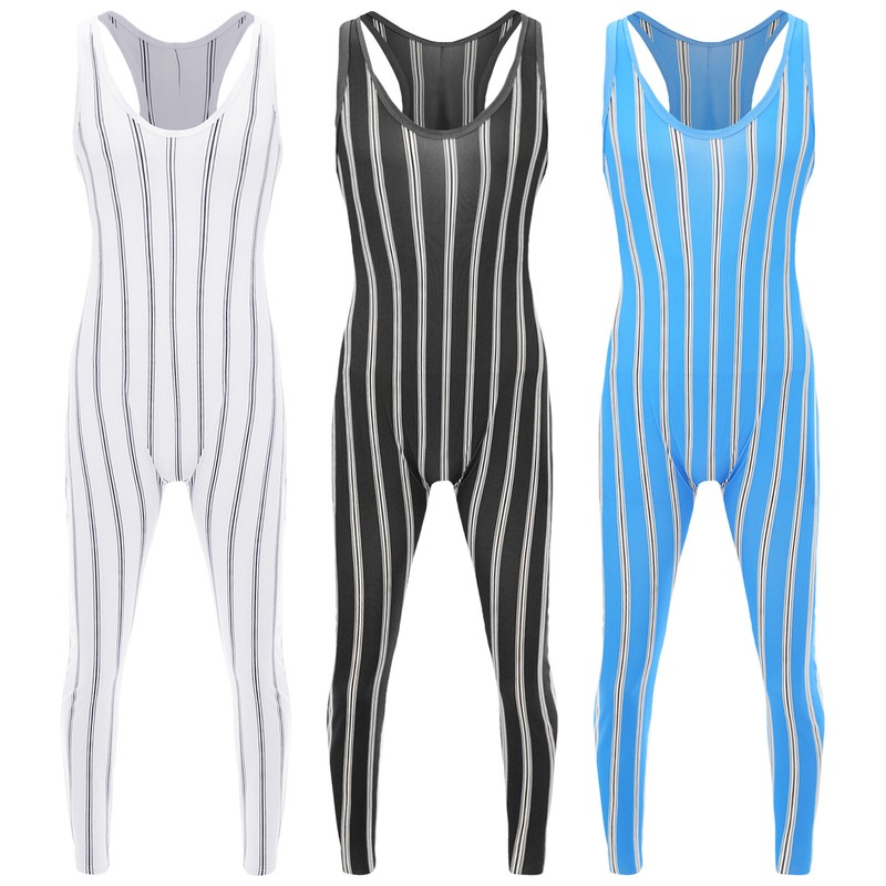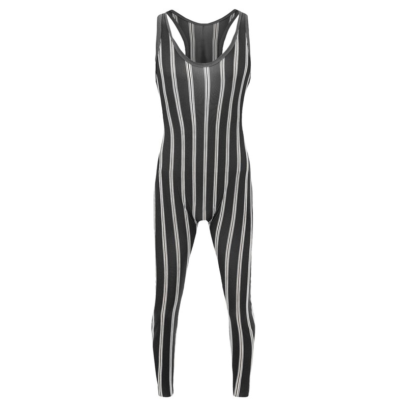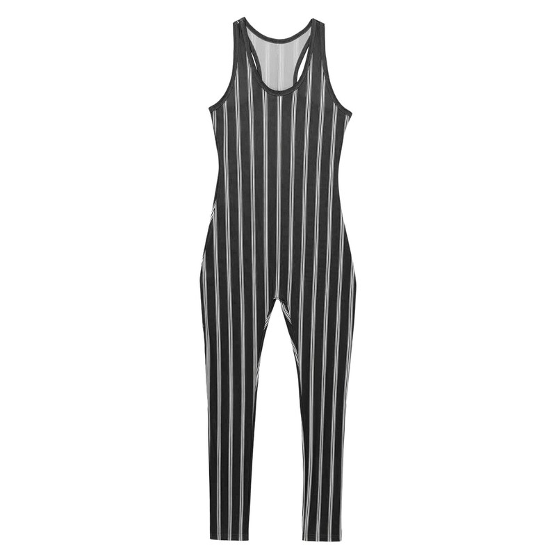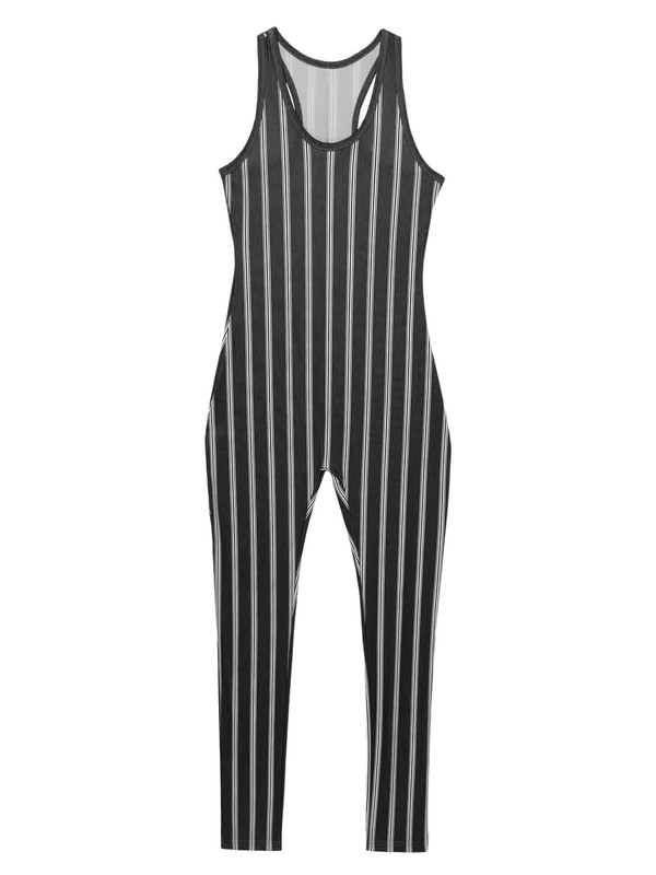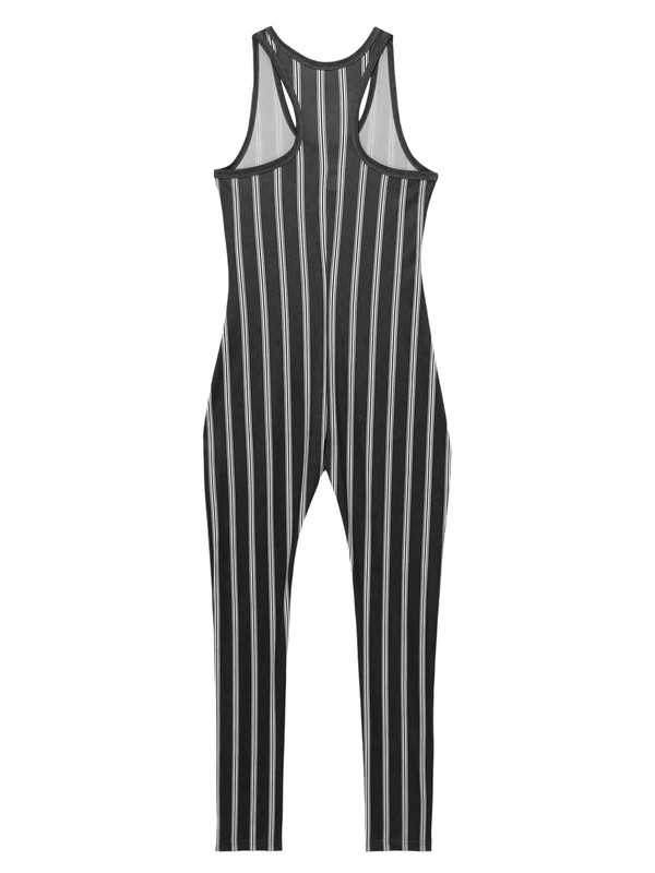 One-piece athletic jumpsuit is designed with scoop neck, sleeveless, racer-back, striped pattern, pullover style and slim-fitting.