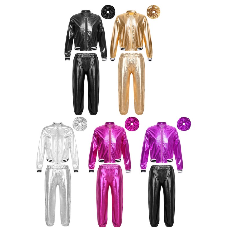Kids girls metallic jacket with pants and hair band for sports.