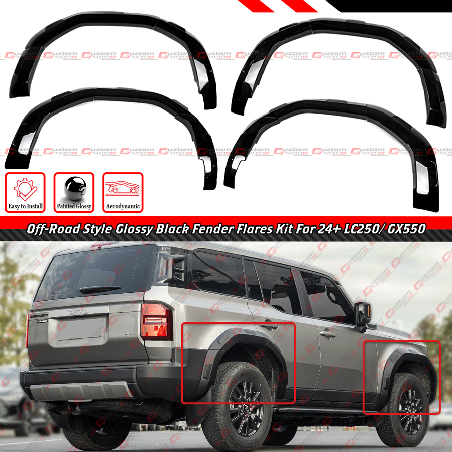- Off-Road Style Gloss Black Finish Add-On Fender Flare Kit For Land Cruiser and GX550. This Kit Features A Special Design With Indented Slots Which Gives the OEM Plus Offroad Vibe To the Car. It Has The Just-Right Thickness and Aggressiveness. Please Refer to the Sizing info Such as Thickness and Height in the Pictures.