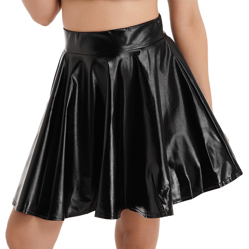 Women Glossy High Waist Flare Skirt Club Stage Costume Party Dancewear Shiny Metallic Ruffle Skirts.