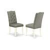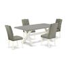 EAST WEST FURNITURE 5-PIECE MODERN DINING SET- 4 EXCELLENT parson DINING ROOM CHAIRS AND 1 DINING ROOM TABLE This 5-piece kitchen table set includes 4 upholstered dining chairs and 1 kitchen dining table. These kitchen chairs have a Linen Fabric seat, Button Tufted Chair Back, and the wood dining table is includes a rectangular top and Wooden Cross Legs. The dining chair seat and the chair back is built from Linen Fabric in a Smoke color parson chairs hardwood frame and the Linen Fabric seat is very easy to clean. You can clean dirt quite simply and frequently to save time by using a damp cloth. These parson dining room chairs and the dining table is the fantastic choice for your dining room or kitchen. The simple design of the upholstered dining chairs and the modern kitchen table as well as screws of the same size that allow simple and fast build. FEATURES: Dining Room Table Set Material: Asian Hardwood Seating Material: Linen Fabric Wood Dining Table Top Color: Cement Breakfast Table Legs Color: Wire brushed Linen White Dining Chair Legs Color: Linen White Upholstered Dining Chairs Fabric Color: Smoke Kitchen Table Dimensions: Length 72; Width 40; Height 30. Upholstered Dining Chairs Dimensions: Length 19; Width 25; Height 41. Included in the Package: One Awesome Kitchen Dining Table and 4 Wonderful Upholstered Dining Chairs.