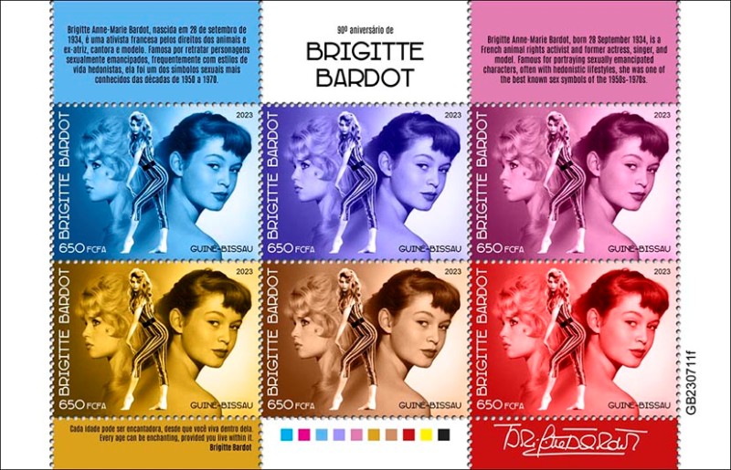 Country: Guinea-Bissau, Year of Issue: 2023, Type: 6 Stamp Sheet, Topic: Brigitte Bardot, French, Actress, Portrait, 90th Anniversary, Animal Rights Activist