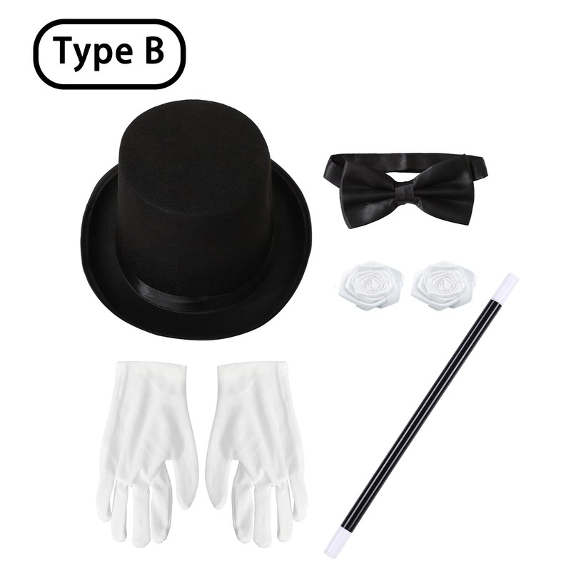 You will get 1pc hat, 1pc bow tie, 1pc magic wand, 2pcs ribbon roses and a pair of gloves. All-in-one accessories meet dress-up party needs.
