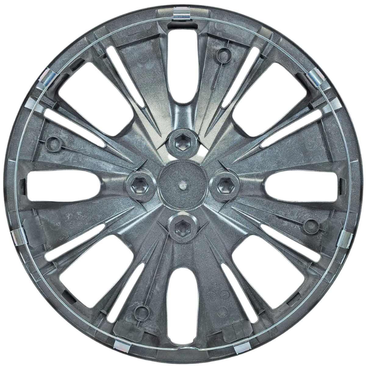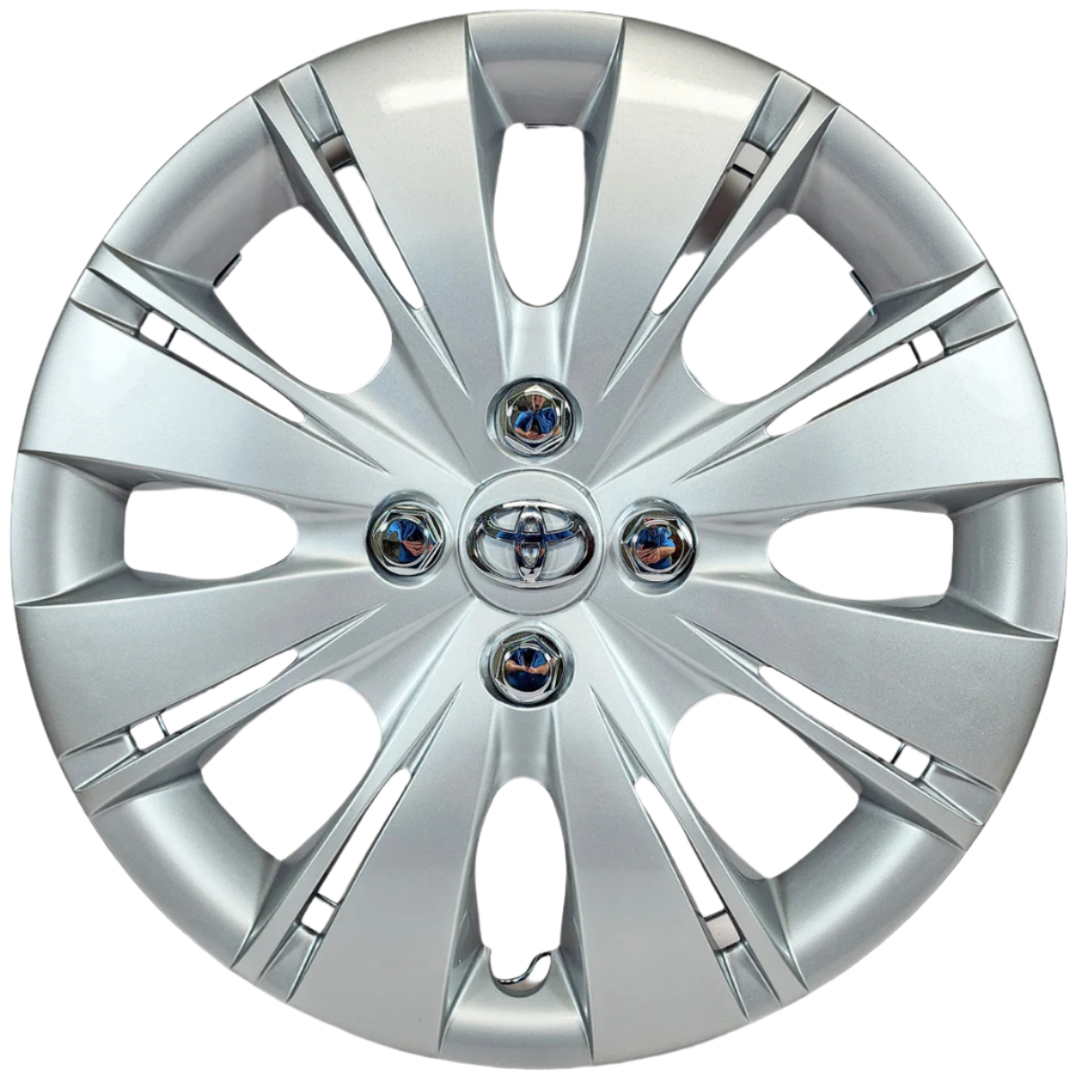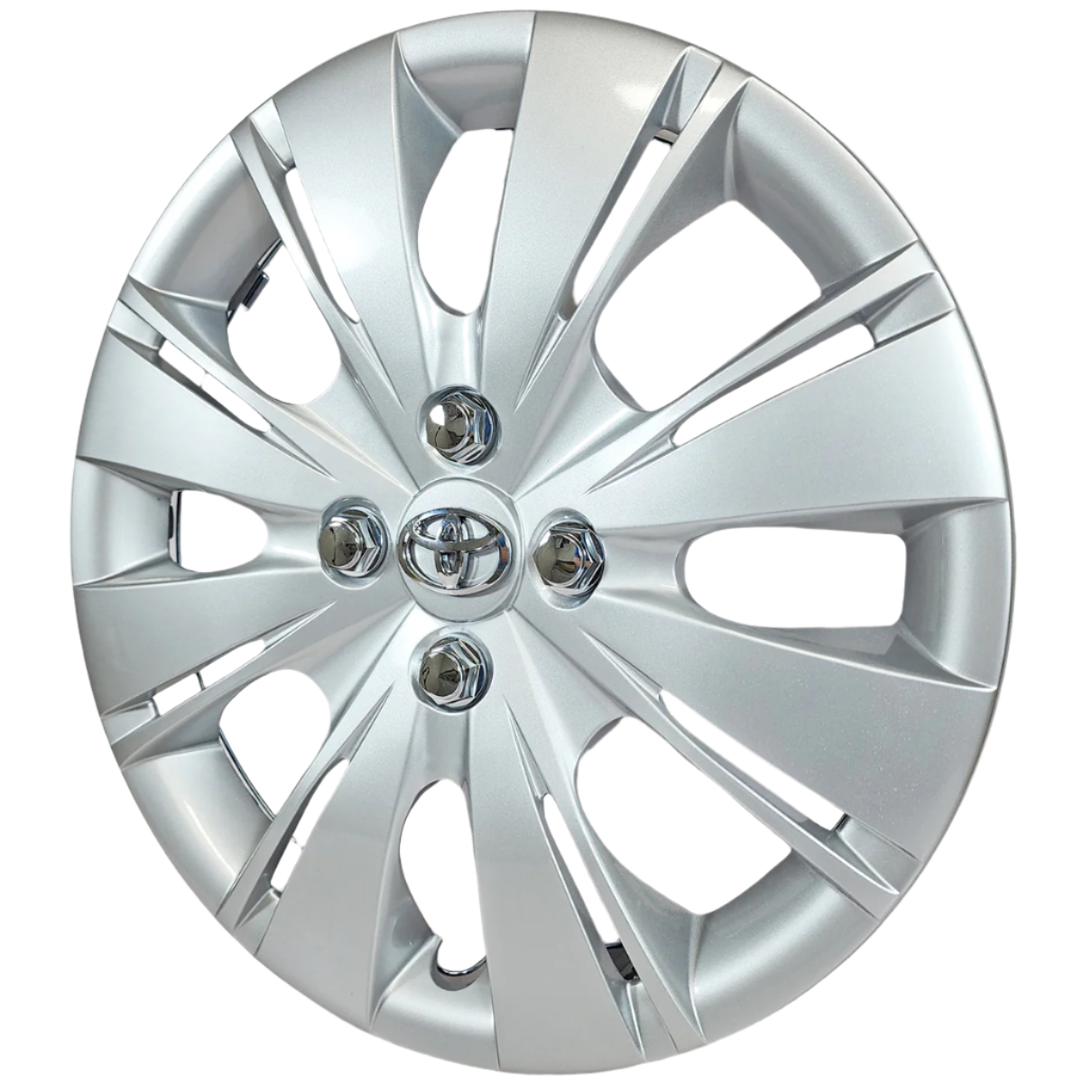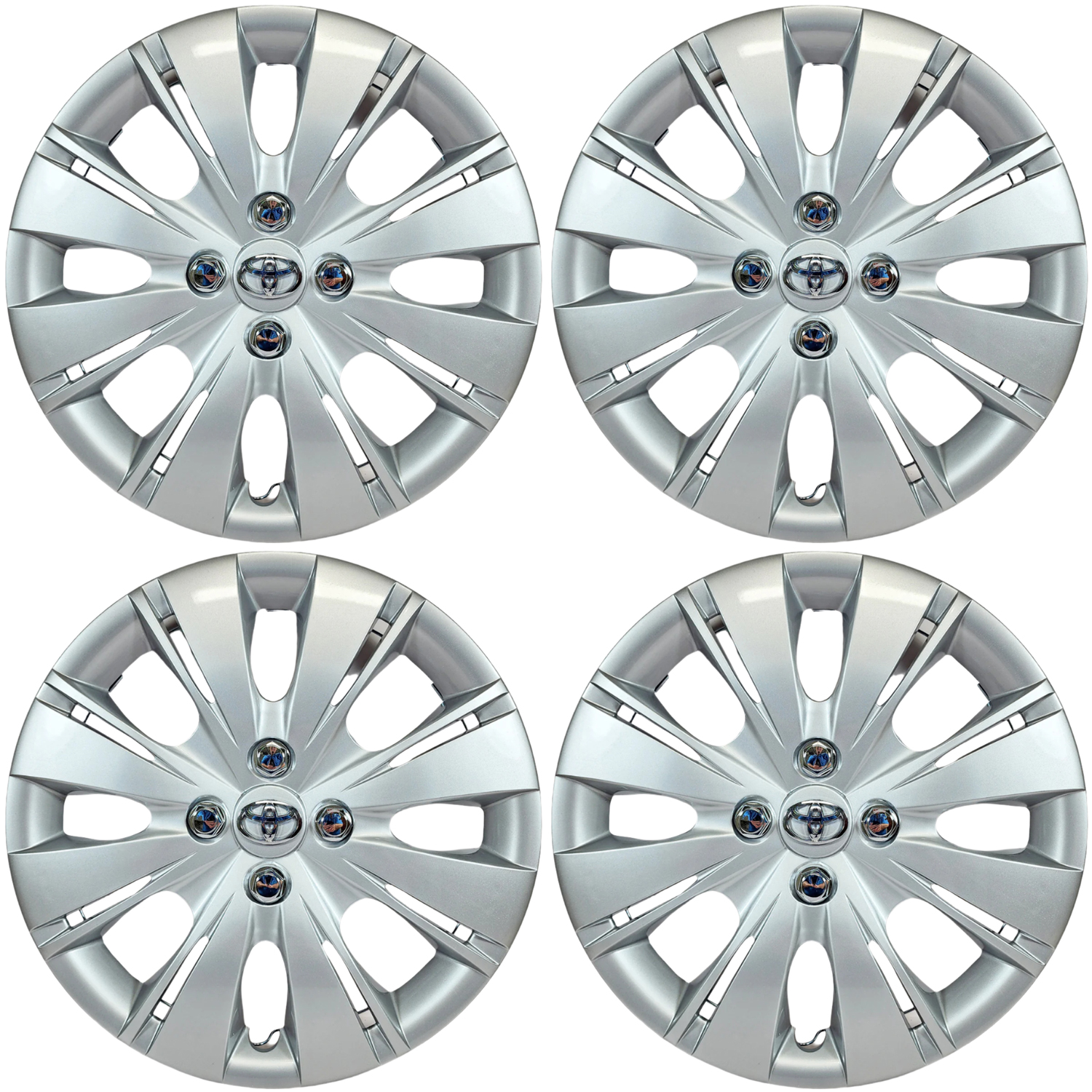 Here is a brand new set of (4) 2012-2015 Toyota Yaris style replacement 15" hubcaps. These hubcaps use a wire retention ring design for a perfect fit on most vehicles. They simply snap on your steel wheel for a quick easy installation. These aftermarket hubcaps are brand new. We added a good condition set of chrome Toyota logo's for a factory appearance. The price quoted is for a set of 4 hubcaps.