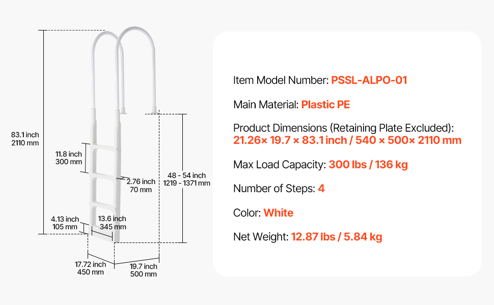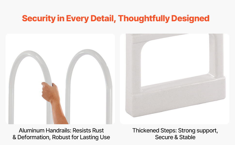 Sturdy & Built-to-last Design: Made of PE material, this swimming pool step is built to withstand all seasons and is fearless to the harsh effects of outdoor sun exposure and aging. You can trust this ladder to avoid accidents and provide durability. The ergonomically designed handrails with rounded edges allow for a comfortable and secure grip