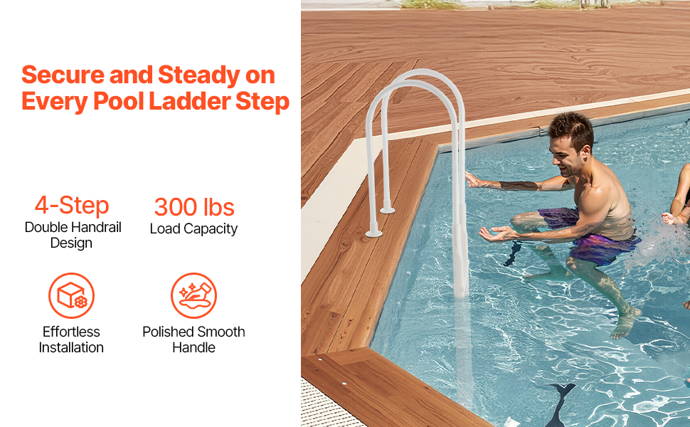 Our 4-step pool ladder with double handrails offers stable, secure entry and exit. It supports up to 300 lb and suits all users. Installation is easy, and the handrails ensure a firm grip. With lasting stability, the ladder is ideal for indoor and outdoor pools.