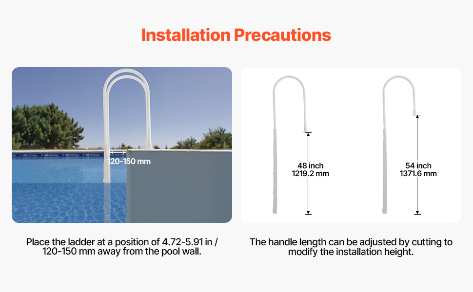 Widened and Thickened Steps: Our pool ladder step features 2.76-inch wide steps, with the bottom step measuring a thick 4.13 inches. This design helps prevent the ladder from floating during installation, ensuring a secure and stable use for both adults and children. Please also ensure that the bottom of the first step is installed close to the pool floor