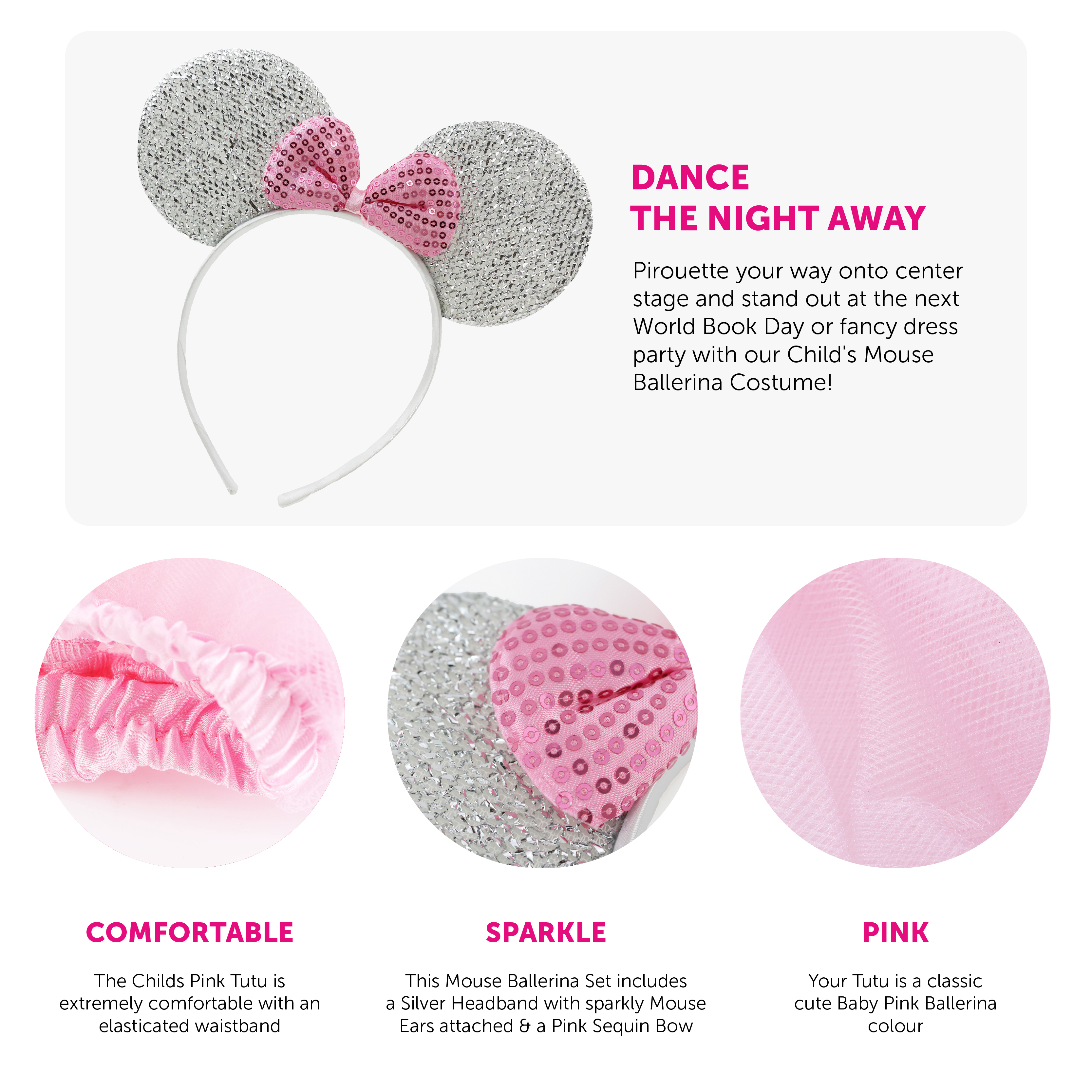 COSTUME INCLUDES: The Child's Mouse Ballerina Costume includes a Silver Headband with sparkly, Silver Mouse Ears attached and a Pink Bow in the middle, and a vibrant Pink Tutu with netted Pink layers and an elasticated waistband, the perfect look for you this World Book Day!