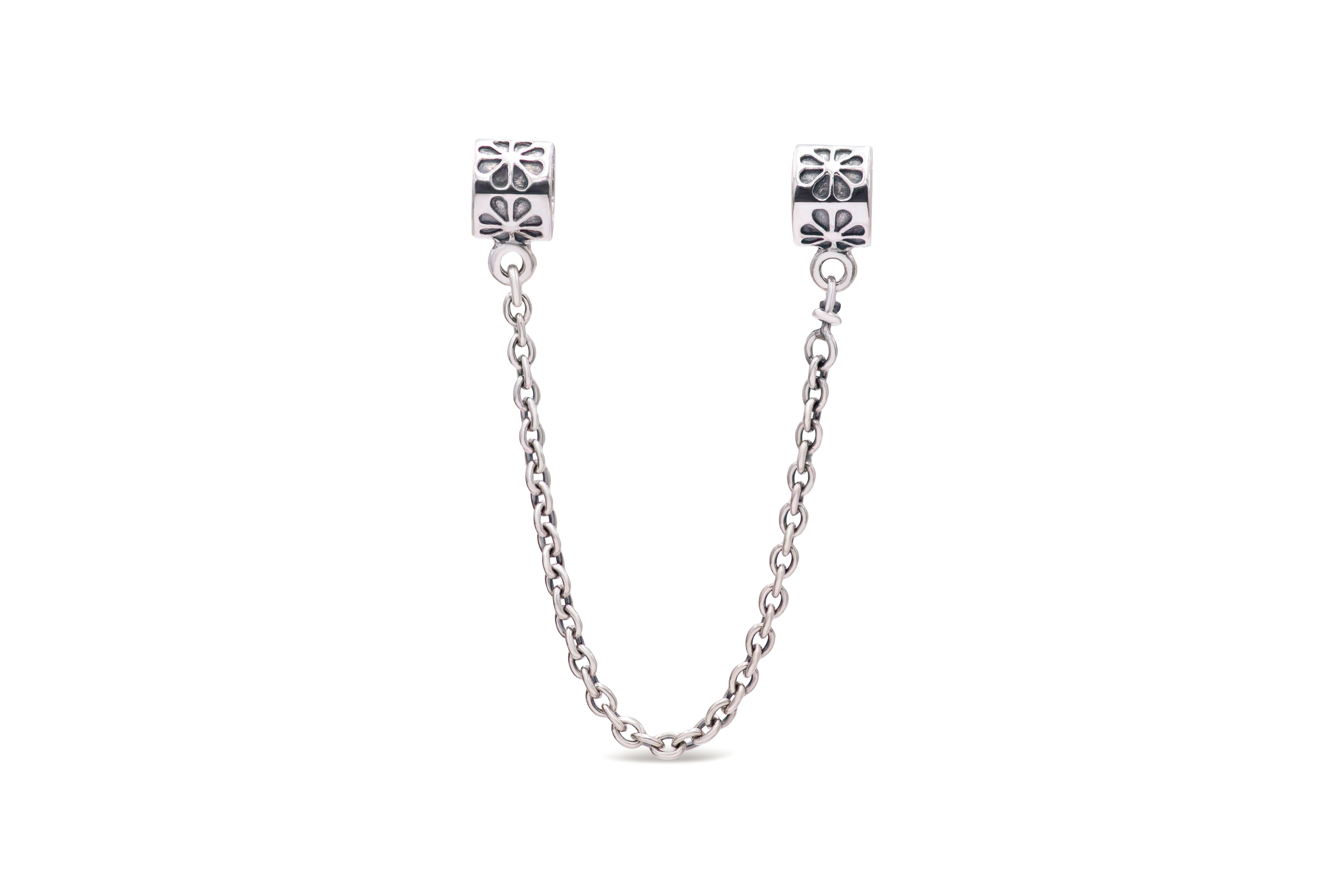 This floral safety chain is a great way to keep your PANDORA even safer when wearing it.The pretty detail in the chain gives you all the more reason to invest in one! The chain and charm are made from sterling silver and the charm has a beautiful floral pattern engraved around the edge.