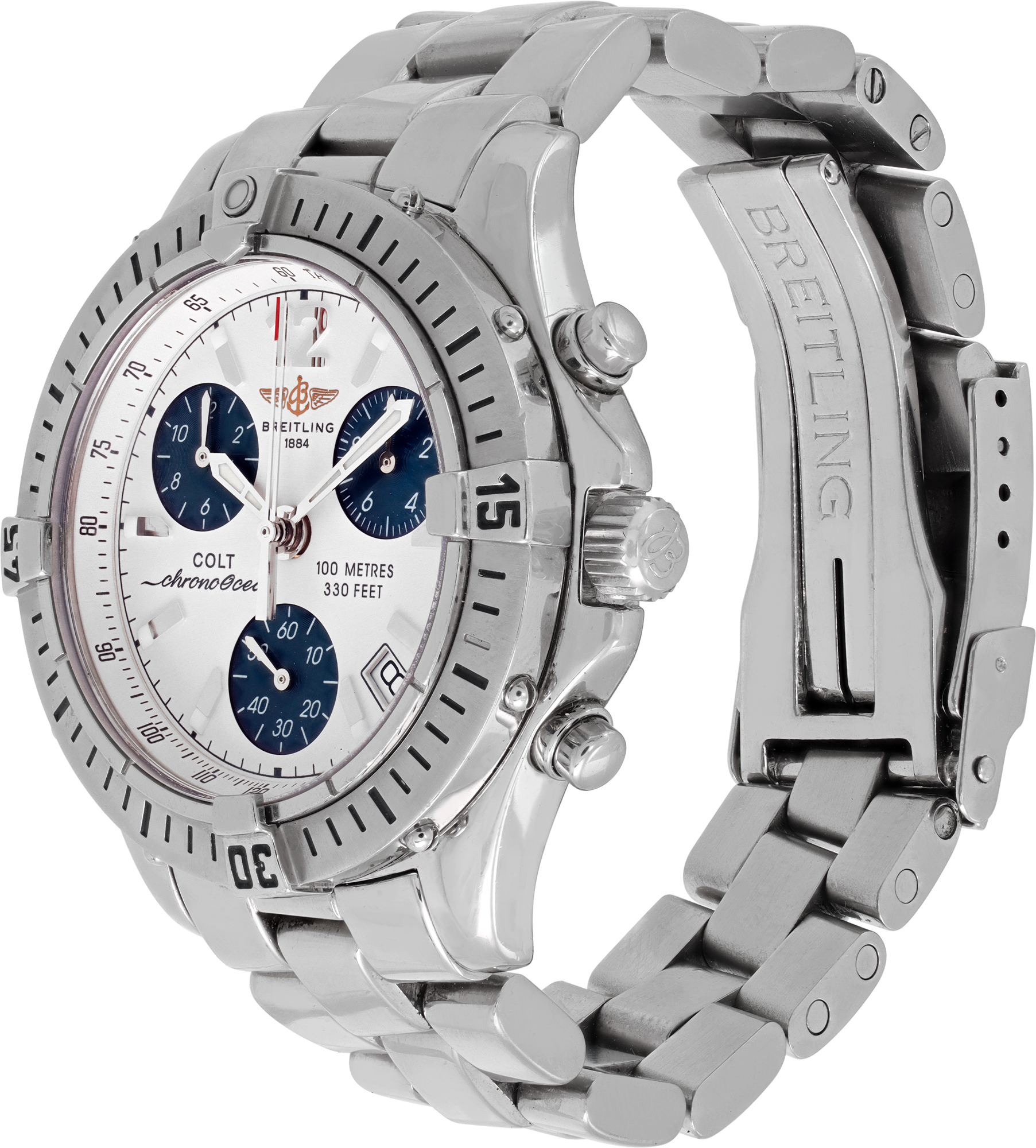 Certified preowned Sport Breitling Colt watch is made out of Stainless steel on a Stainless Steel bracelet with a Stainless Steel Fliplock buckle. This Breitling watch has a 38 x 38 mm case with a Round caseback and White Chronograph dial. It is Gray and Sons Certified Pre-Owned and comes backed by our 12-month warranty. Each watch is inspected by our certified in-house master-trained watchmakers before shipment including final servicing, cleaning, and polishing.
