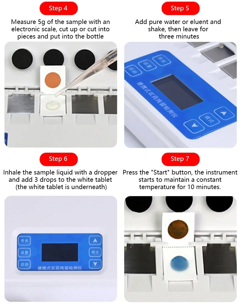 Food Safety Testing Vegetable Pesticide Residue Rapid Detector Instruments Fruit The first step: the instrument is connected to the power supply (if the instrument is powered without the need to connect the power supply), press and hold the long ‘switch’ to the indicator light up. The second step: the instrument is switched on and automatically heated to 38 ℃ ℃ heating is completed after the issue of ‘tick’. Step 3: Tear off the protection of the test card. Step 4: Cut or cut with an electronic scale to measure 5g of sample, blocks into the bottle Step 5: Add pure water or elution solution and shake, and then leave it for three minutes. Step 6: Inhale the sample liquid with a dropper and drop 3 drops to the white tablet (white tablet is under) Step 7: Press the ‘Start’ button, the instrument starts to maintain a constant temperature for 10 minutes. Step 8: When the constant temperature is finished, close the lid and start colour development for 3 minutes. Step 9: After the test, open the lid and observe the colour development of the test card.