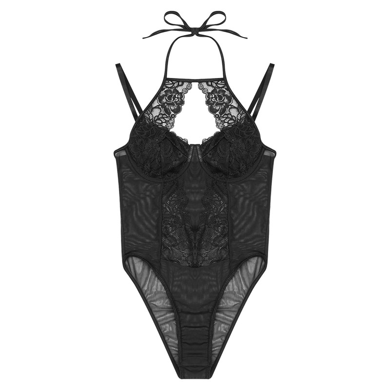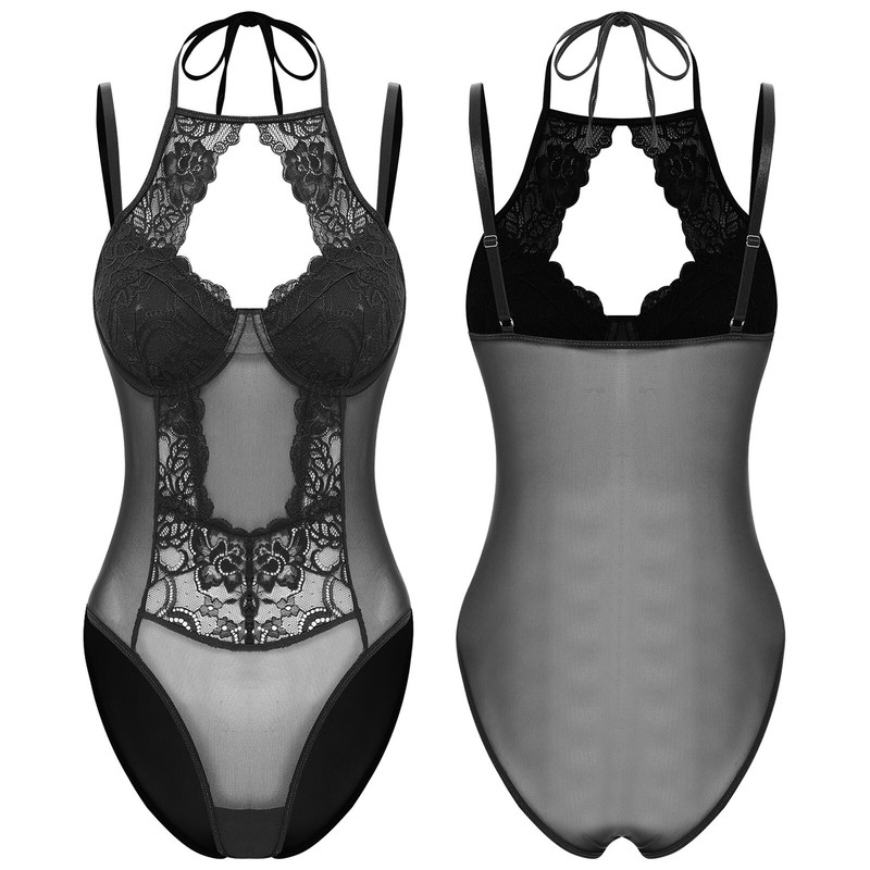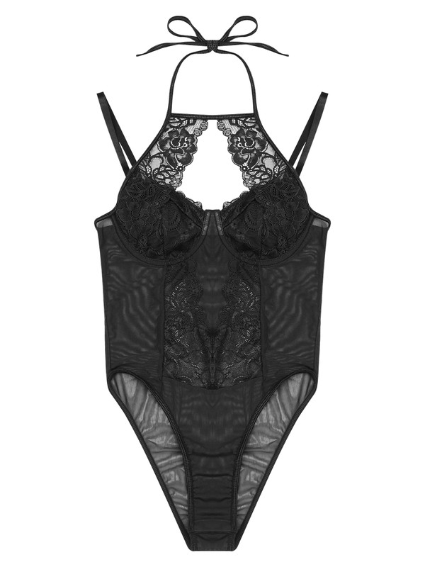 A lace lingerie costume for women, designed with halter neck, spaghetti straps, front cut out show off your charming boobs.