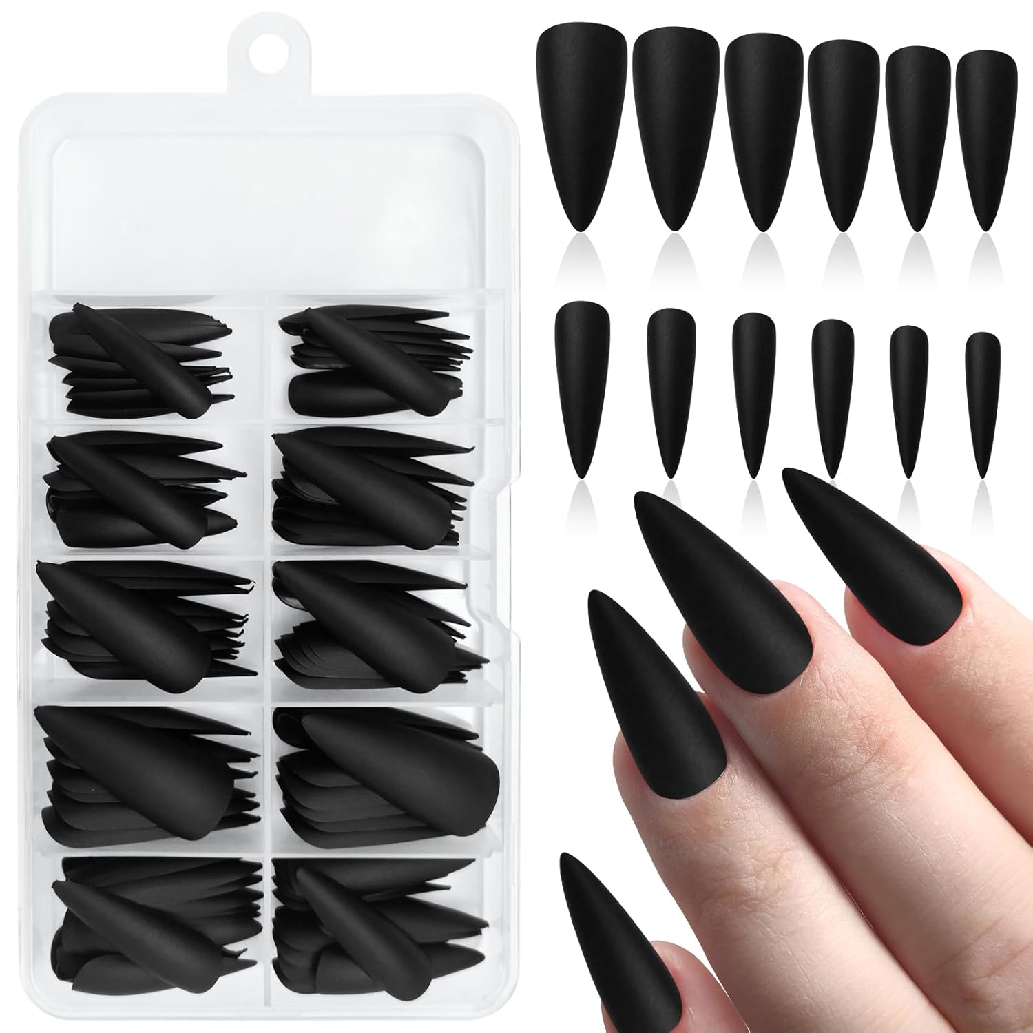 Bellelfin 120pcs Long Press on Nails for Nail Art, Manicure Salons for Women Girls at Home Feature: Long stiletto fake nails Color: black nails Quantity: 120pcs false nail tips Size: 12 size Coverage: Full Cover matte press ons false nail tip Long stiletto press on nails are made of high quality materials, strong and durable, not easily break and broken. The bottom of the nail tip is soft, thin and flexible, which can be perfectly blended with the natural nails, making it more comfortable to wear and more natural in effect. Just look like real nails. Artificial acrylic nail tip very easy to apply, you can use nail glue or jelly adhesive stickers without gel polish uv light and uv nail lamp, can get a natural professional looking nails in minutes. How to use: 1. Prepare your nails--keep it dry and without oil. We recommend push your nail cuticle and file nail surface for get more natural and long lasting effect. 2. Select correct fake nails for your each fingernails 3. Apply nail glue or adhesive glue sticker on fake nails 4. Press on you nails and holds 15 seconds (Make sure there is no air between your natural nails and the tips Tips: Using nail glue makes the press on false nails long lasting, but using adhesive glue sticker allows reusable of fake nail tip Do not get water within 3 hours of wearing nails