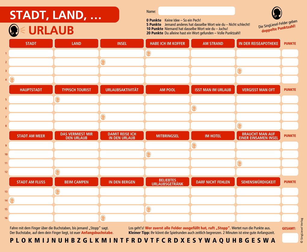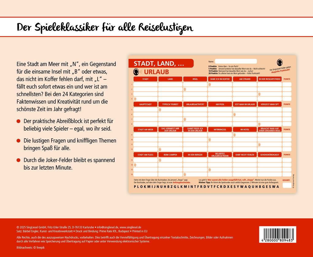 Eine Stadt am Meer mit "N", ein Gegenstand für die einsame Insel mit "B" oder etwas, das nicht im Koffer fehlen darf, mit "L" -fällt euch sofort etwas ein und wer ist am schnellsten? Bei den 24 Kategorien sind Faktenwissen und Kreativität rund um die schönste Zeit im Jahr gefragt! Der praktische Abreißblock ist perfekt für beliebig viele Spieler - egal, wo ihr seid. Die lustigen Fragen und kniffligen Themen bringen Spaß für alle. Durch die Joker-Felder bleibt es spannend bis zur letzten Minute.