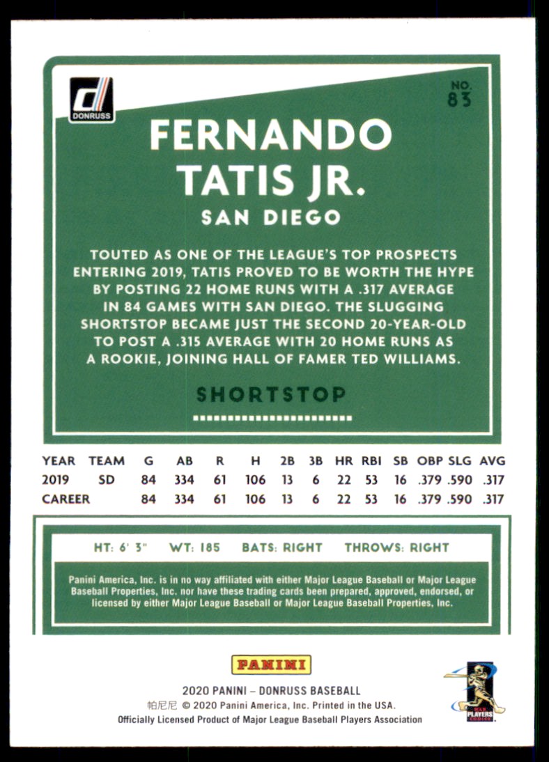 | 2020 Donruss Holo Pink Fernando Tatis Jr. San Diego Padres #83 | ||||||||||||||||