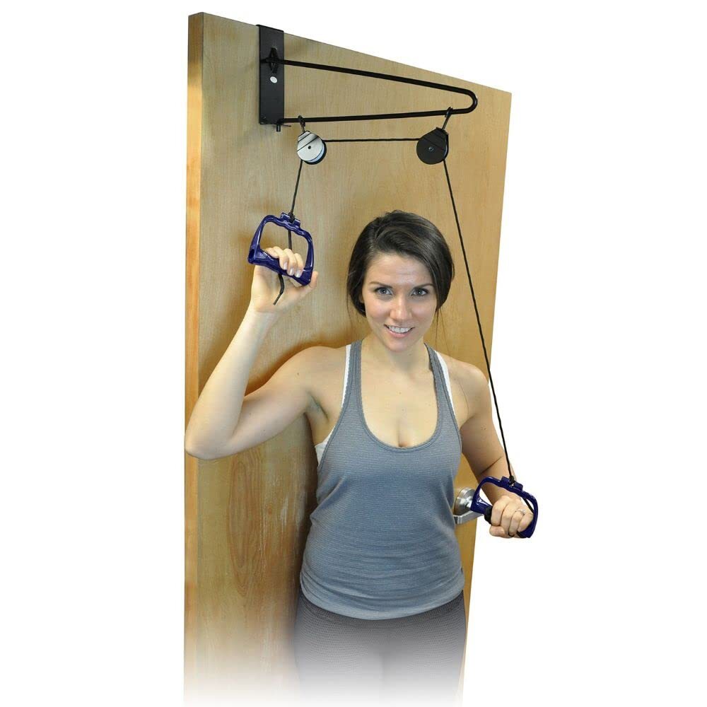 Designed to safely and easily increase range of motion or rehab shoulder arm upper body or torso Exerciser has two pulleys for smooth and easy operation Portable exerciser can be easily transported and fitted to standard doors Extra-long adjustable rope can be used in a standing or seated position Molded ergonomic handles provide a comfortable hand grip Can be used in a clinic setting or in the comfort of your own home Includes: (2) ergonomic handles (1) 81/2' rope (2) pulleys (1) pulley assembly & (1) door bracket
