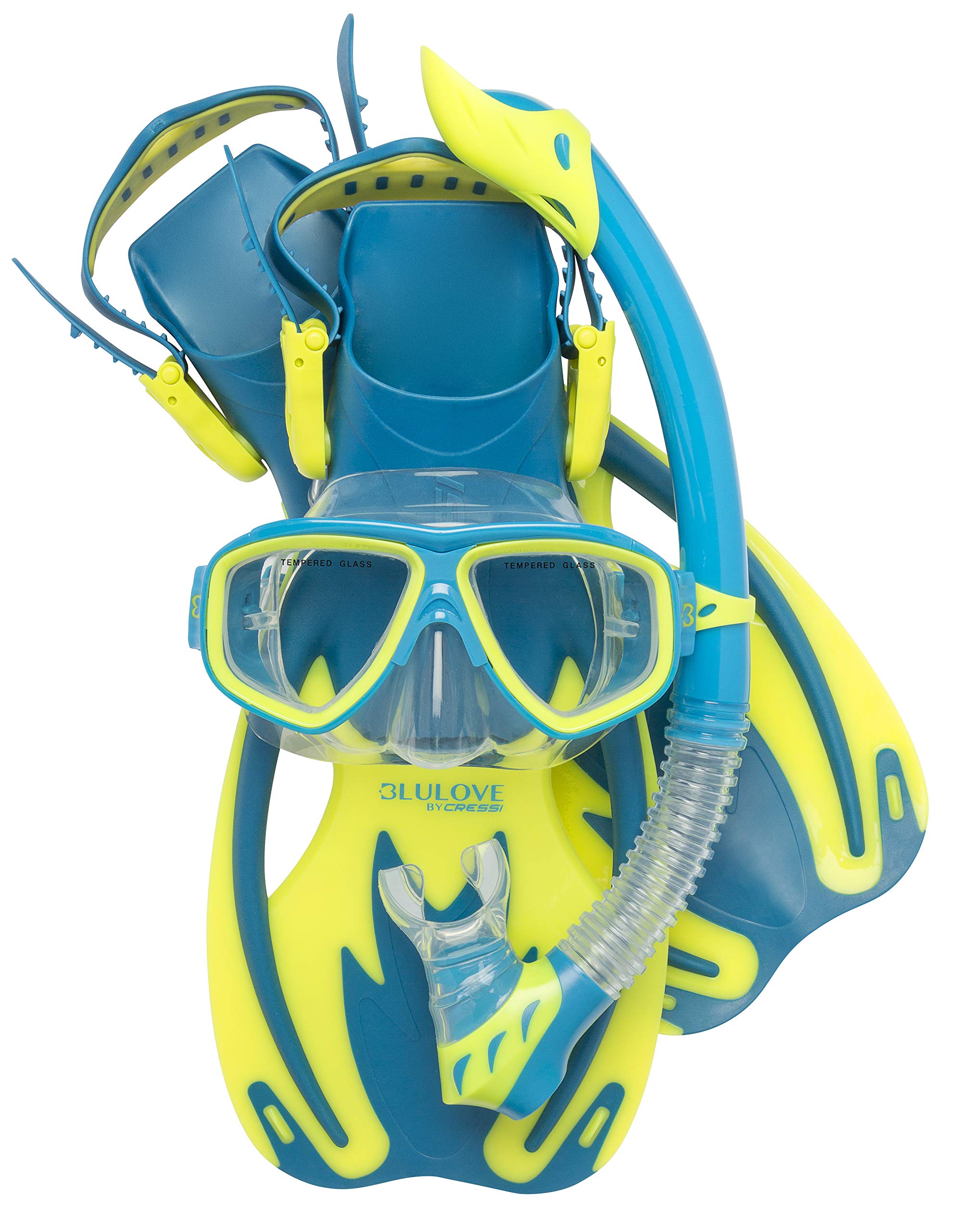 Rocks Kids Set is Cressi's answer to the price conscious parents who need reliable snorkel equipment for their kids for vacation use. We offer with this line the solution for adventurous kids who need decent quality for all day use in the pool or in the ocean. The Rocks Mask lenses are made from tempered glass and the dual window design provides excellent and a wide field of vision. Mask has an easy-to-reach nose pocket for ear equalization. The snorkel features the splash guard designed to prevent splashed surface water from entering inside the snorkel barrel. The soft and replaceable mouthpiece, in combination with the flex tube section, allow for hours of comfortable snorkeling fun. The one-way purge valve below the mouthpiece allows and water in the tube to drain-rapidly. The snorkel comes complete with an easy-to-use snorkel keeper for attachment to the mask strap. Soft and comfortable vented open heel foot pocket with easy to adjust buckles designed to follow the kids growth. The strap has a Quick-Release Easy-Adjust buckle with large-thumb-loop for easy donning and doffing. Dual composite vented blades provide excellent power and energy saving efficiency. The product is designed in Italy by Cressi and made in China. Cressi has been a brand pioneer in scuba diving, snorkeling, and swimming equipment since 1946. The product is covered by a 2-year limited warranty.