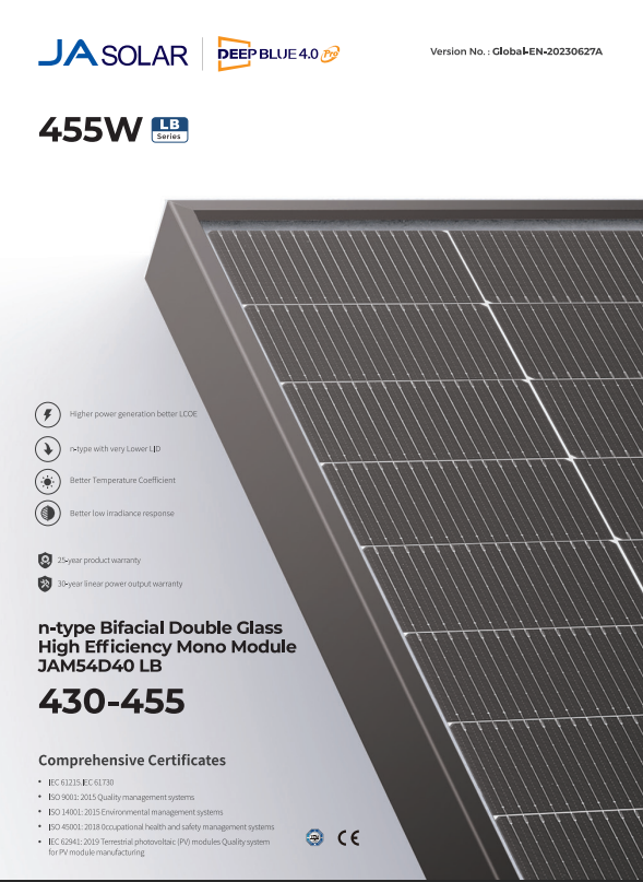 Erzeugen Sie nachhaltige Energie mit den bifazialen Modulen von JA Solar. Das innovative Modul JAM54D41/LB vereint modernste DeepBlue 4.0 Technologie mit hoher Leistung und elegantem Design. Die schwarze Rahmenkonstruktion verleiht ihm eine moderne und stilvolle Optik.