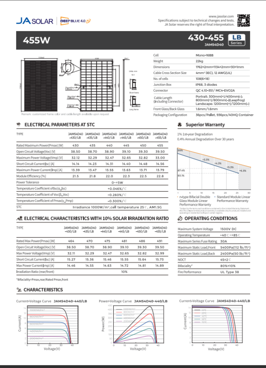 Die DeepBlue 4.0 Technologie bietet verbesserte Lichtaufnahme und reduzierte Zellverluste, was zu einer höheren Energieausbeute führt. Das JA Solar JAM54D41/LB ist ein bifaziales Glas-Glas-Modul, das sowohl die direkte Sonneneinstrahlung als auch reflektiertes Licht, das auf die Rückseite fällt, zur Stromerzeugung nutzen kann. Dank dieser Funktion erzielen Sie eine höhere Energieausbeute und maximieren Ihre Energieerträge. Als Glas-Glas-Modul ist es zudem besser gegen Umwelteinflüsse geschützt als herkömmliche Glas-Folie-Module. Zusätzlich bietet das Modul ein verbessertes Temperaturverhalten, wodurch es auch bei höheren Temperaturen effizient arbeitet und weniger Leistungsverluste aufweist.