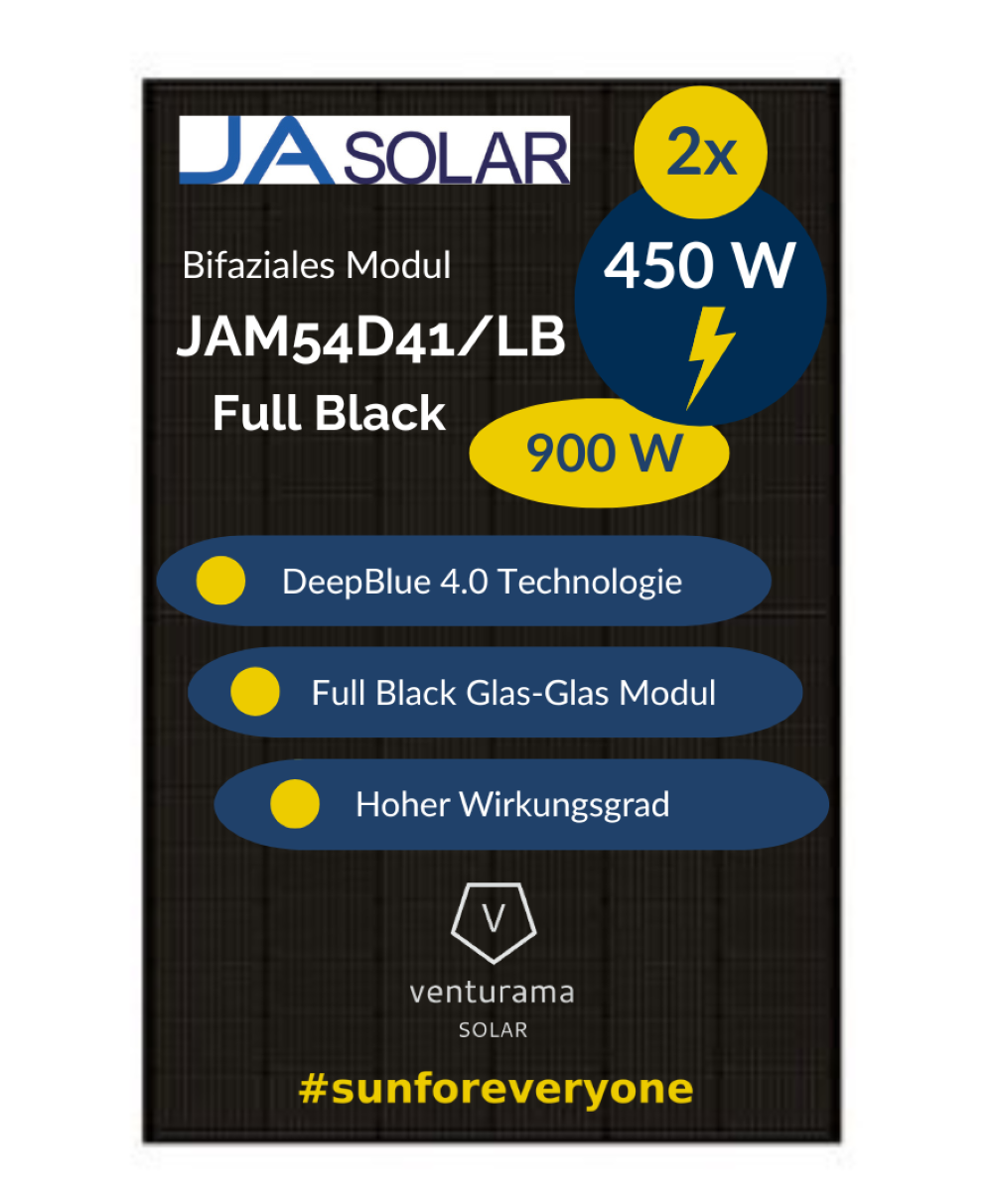 Die DeepBlue 4.0 Technologie bietet verbesserte Lichtaufnahme und reduzierte Zellverluste, was zu einer höheren Energieausbeute führt. Das JA Solar JAM54D41/LB ist ein bifaziales Glas-Glas-Modul, das sowohl die direkte Sonneneinstrahlung als auch reflektiertes Licht, das auf die Rückseite fällt, zur Stromerzeugung nutzen kann. Dank dieser Funktion erzielen Sie eine höhere Energieausbeute und maximieren Ihre Energieerträge. Als Glas-Glas-Modul ist es zudem besser gegen Umwelteinflüsse geschützt als herkömmliche Glas-Folie-Module. Zusätzlich bietet das Modul ein verbessertes Temperaturverhalten, wodurch es auch bei höheren Temperaturen effizient arbeitet und weniger Leistungsverluste aufweist.