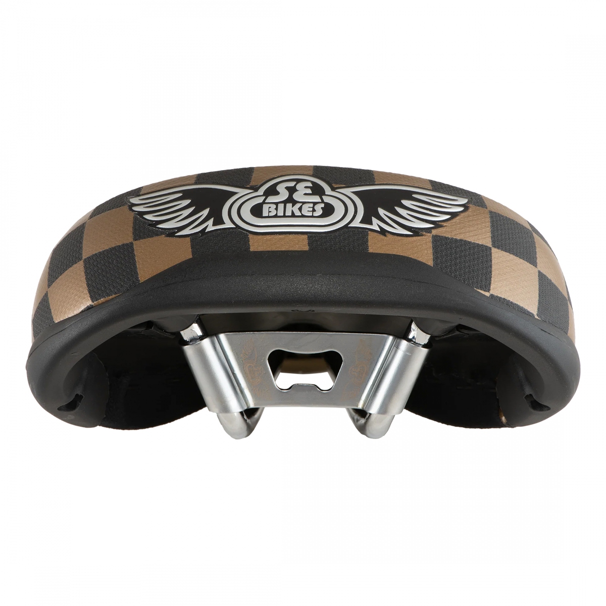- Vintage-inspired BMX saddle with SE Bikes wings logo and checkerboard design