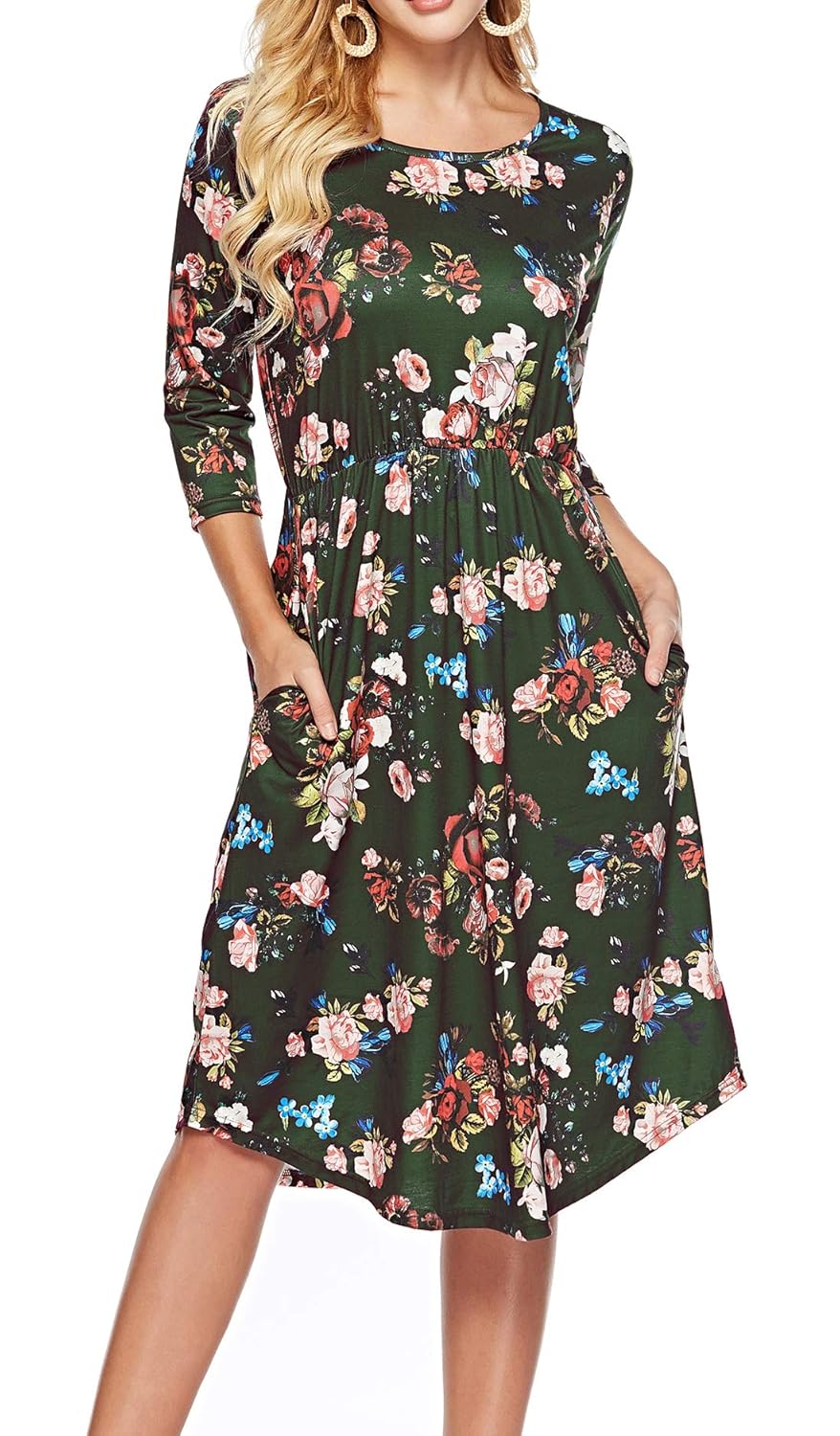 Unique Style: 3/4 sleeve, long sleeve, round neck, elastic waist, floral print, color block, two handy side pockets, casual style, pockets dress, pleated dress, loose dress, casual swing midi dress with pockets.