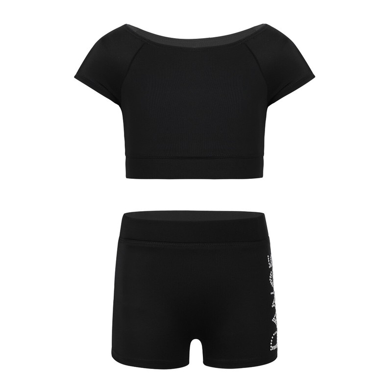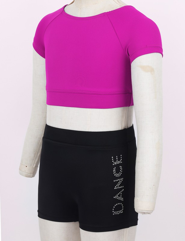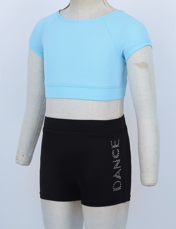Matching wide stretchy waistband bottoms with shiny rhinestone letters "DANCE" at one side.