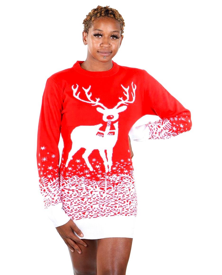 SOCAL LOOK- Women's Long Sleeve Christmas Sweater Festive and colorful design to bring cheer to this Christmas holiday. This long-sleeved dress sweater has a rib knit crewneck and rib Cuff & Bottom for a comfortable fit. Made of 100% Premium Acrylic Intarsia jacquard knit high quality double-panel construction with reinforced seams. Red Reindeer front artwork & snowflake design in Sleeves, Plain solid black on back. Machine washable and very easy to maintain. Let's make this world a better place, one Christmas sweater at a time!