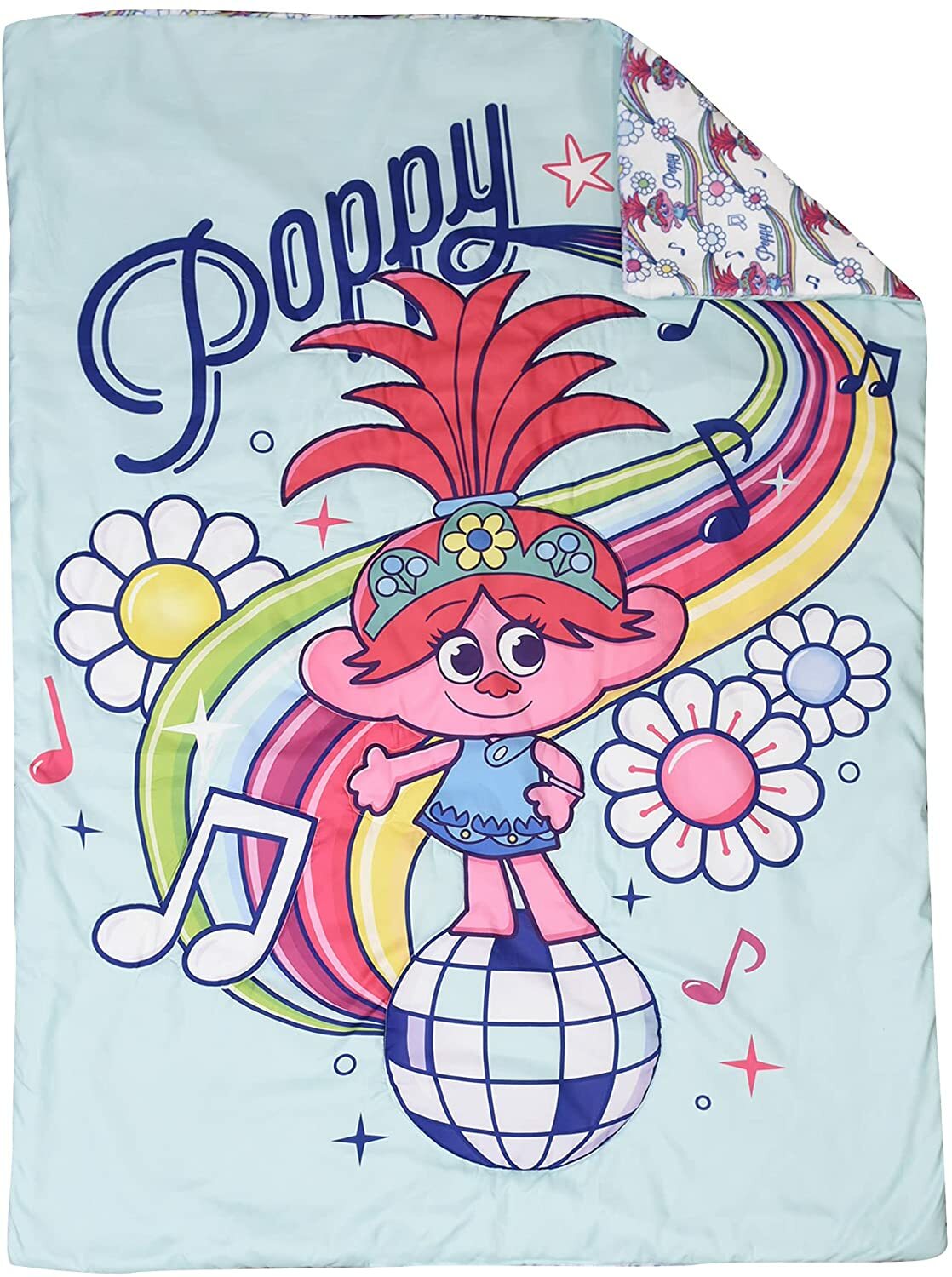 Join Poppy as she dances and sings with her friends, Queen Barb and Delta Dawn, on this cozy reversible 3 piece toddler bedding set. The fabric is soft to the touch and gentle on your child's skin. Made to feel like a warm embrace, this cozy set is sure to be a favorite. Features an Officially Licensed Trolls design of the happy-go-lucky future leader of Troll Village, Poppy. Change the look of your little one's bedroom in one easy flip! The front side features a bright and bold design while the reverse has an adorable all-over print. Item is machine washable. See level for specific instructions.
