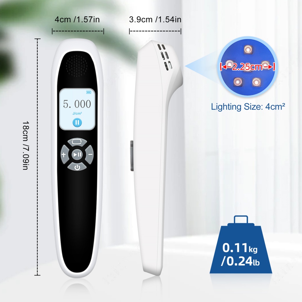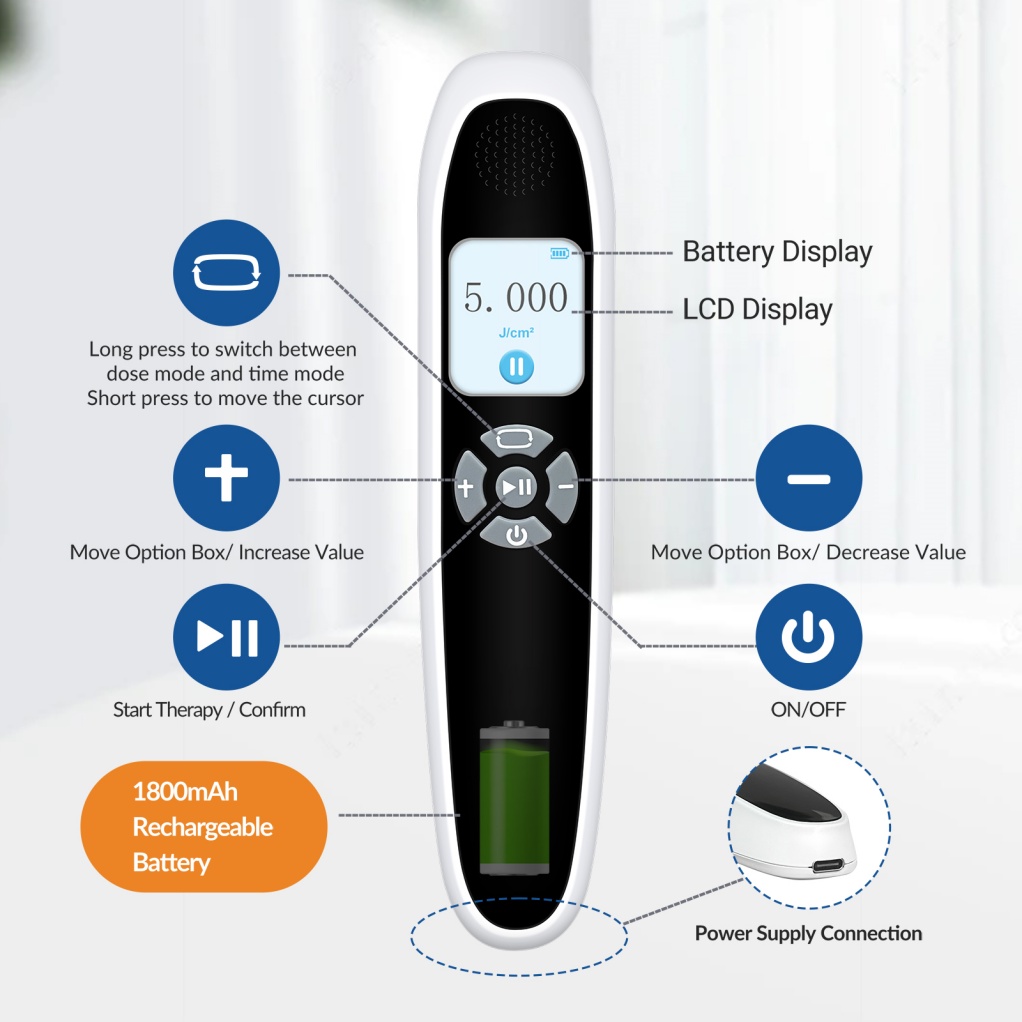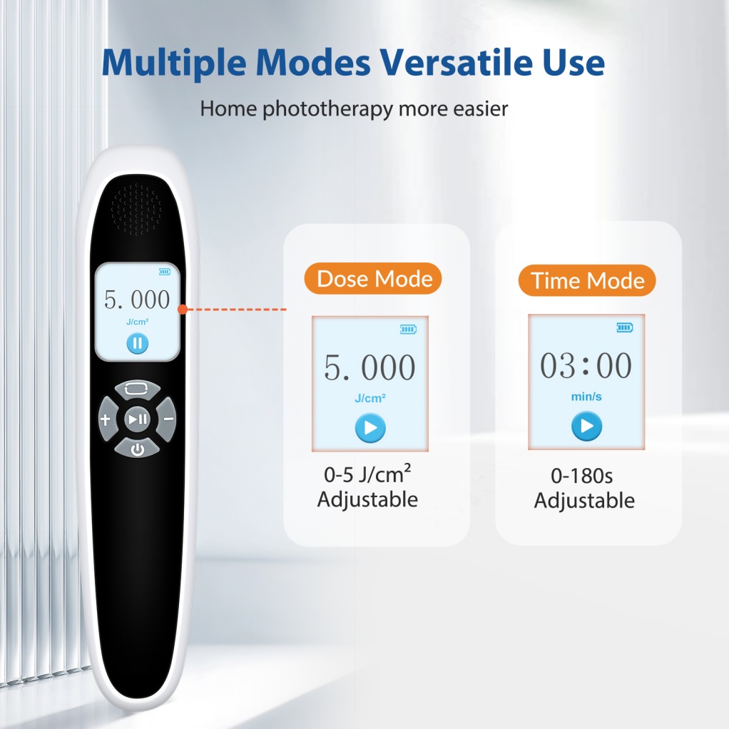 【Multi-functional Mode】The diameter of the lamp bead area of the ultraviolet light therapy lamp is 2.25cm, the irradiation area is 4cm², and the irradiation intensity is 20mW/cm². Dose mode :0-5J/cm² adjustable,Time mode 0-180s adjustable. Phototherapy treatment involves exposure to the light for very short periods of time (1 seconds-180 seconds), 3-4 times each week.