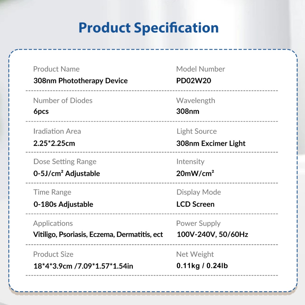 【Packing and Service】Our excimer phototherapy device includes 1* Host, 1* Protective Glasses 1* Packing Box, 1* User Manual, and 1* Power Supply; 308nm excimer treatment for vitiligo photo therapy involves exposure to the light for very short periods of time (between 1 second and a maximum of 180 seconds) 3-4 times each week, typically seeing results within 4 to 8 weeks. Also we will provide 1 year warranty for this 308nm phototherapy lamp device from the date you order. If you have any questions about our phototherapy light for Vitiligo Psoriasis, please email us and we will solve your problem within 24 hours.