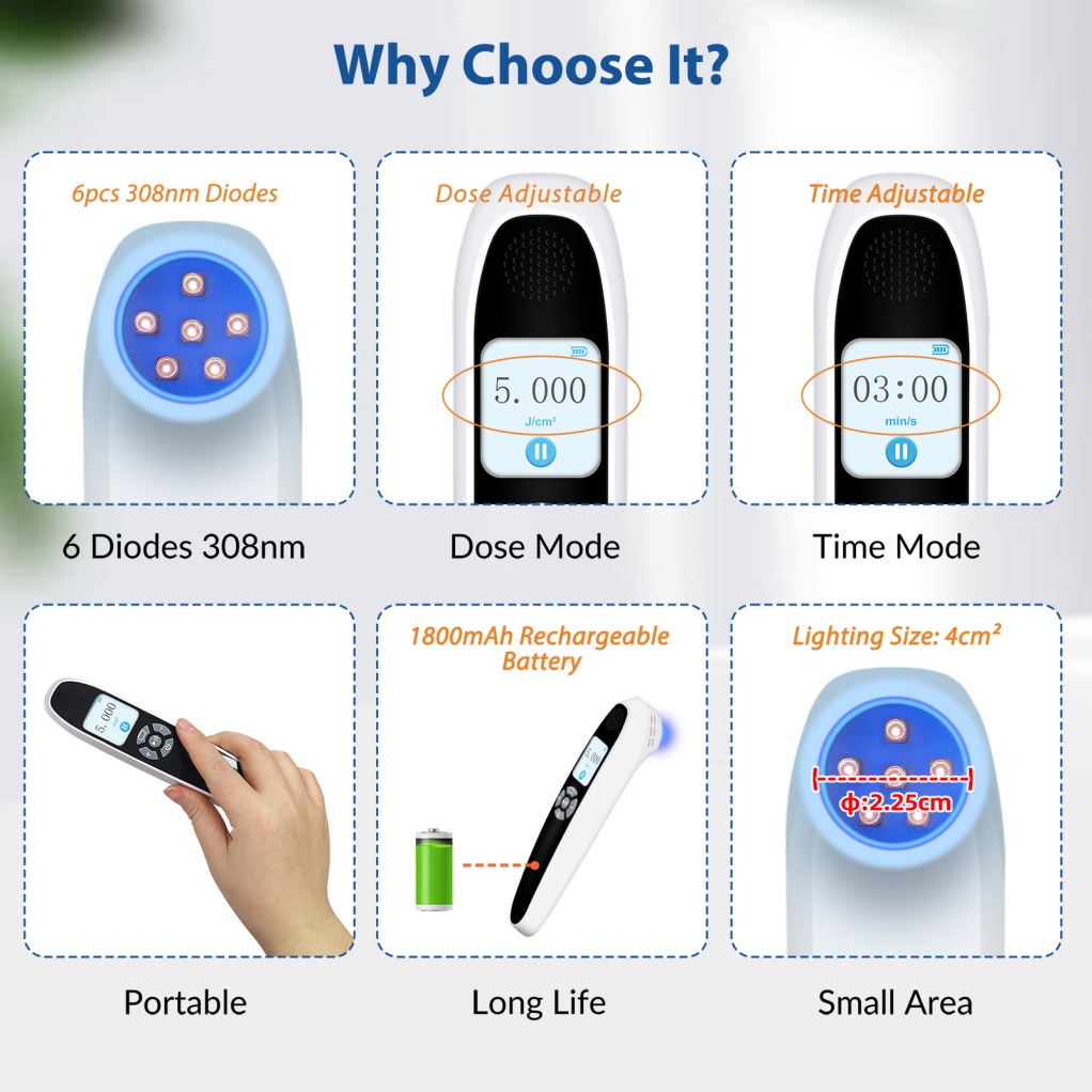 【More applications】308nm UVB light phototherapy is widely used for vitiligo, psoriasis, eczema and other skin disorders. Home phototherapy UVB lamp is used in cases where Vitiligo is on the 'Joint and Movement' areas of the body, (hands, elbows, knees, feet, etc.) and the stubborn spots or patches. And the handheld UVB phototherapy device is also used for other skin diseases such as psoriasis, atopic dermatitis (eczema) and for the treatment of Vitamin D deficiency.