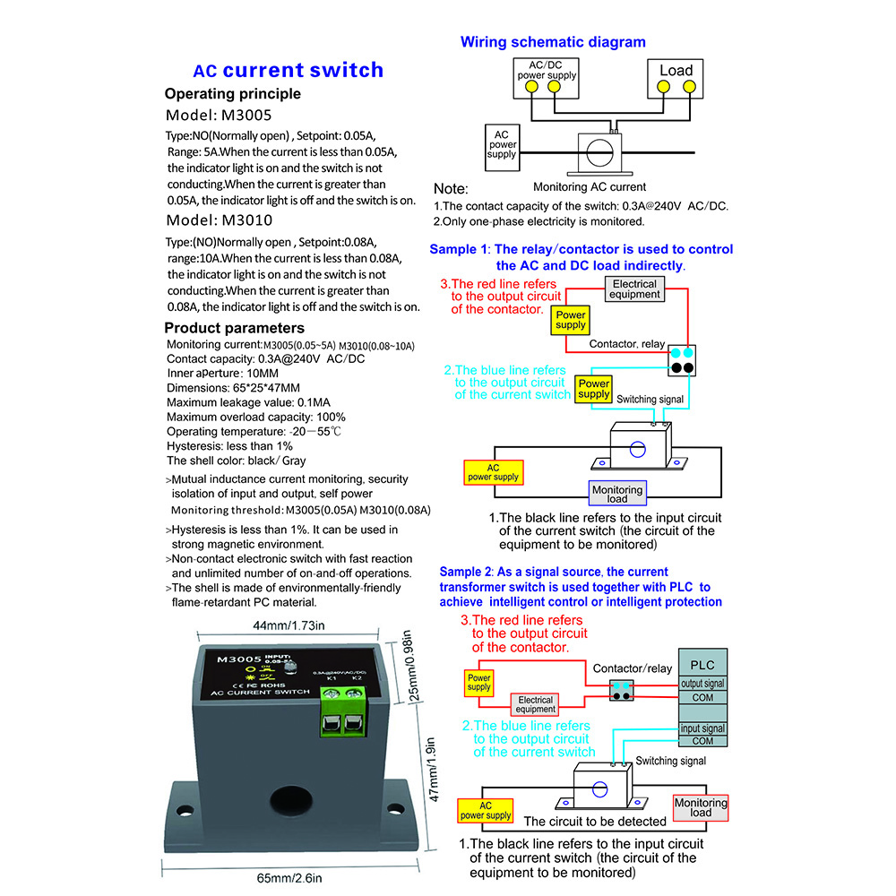 Monitoring current: M3005(0.05~5A) M3010(0.08~10A)