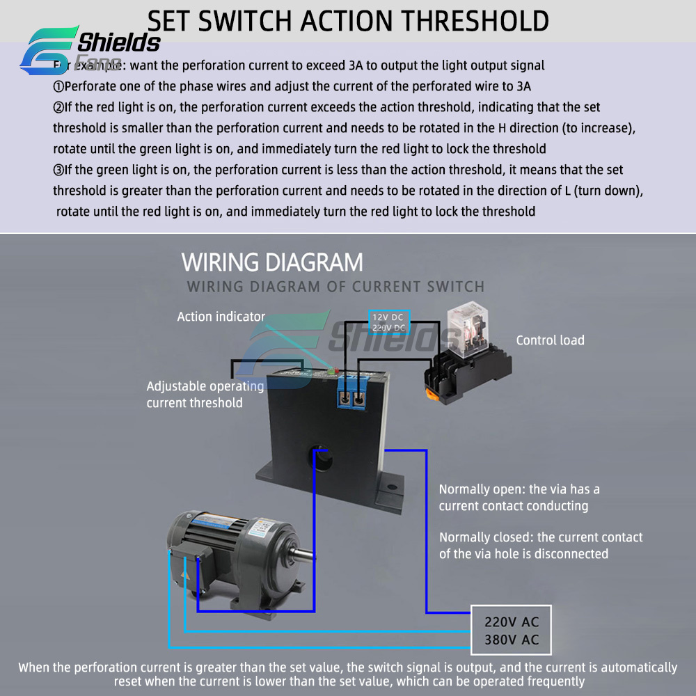 Normally open type, threshold 0.05A, range 5A When the current is less than 0.05A, the indicator light is on and the switch does not conduct When the current is more than 0.05A, the indicator light is off and the switch conducts.