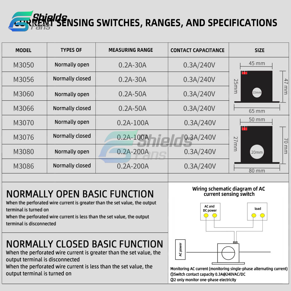 Optional models: M3050 normally open, M3056 normally closed (0.2A-30A), M3060 normally open, M3066 normally closed (0.2A-50A), M3070 normally open, M3076 normally closed (0.2A-100A), M3080 normally open, M3086 normally closed (0.2A-200A), M3005 normally closed(0.05~5A), M3010 normally closed(0.08~10A).