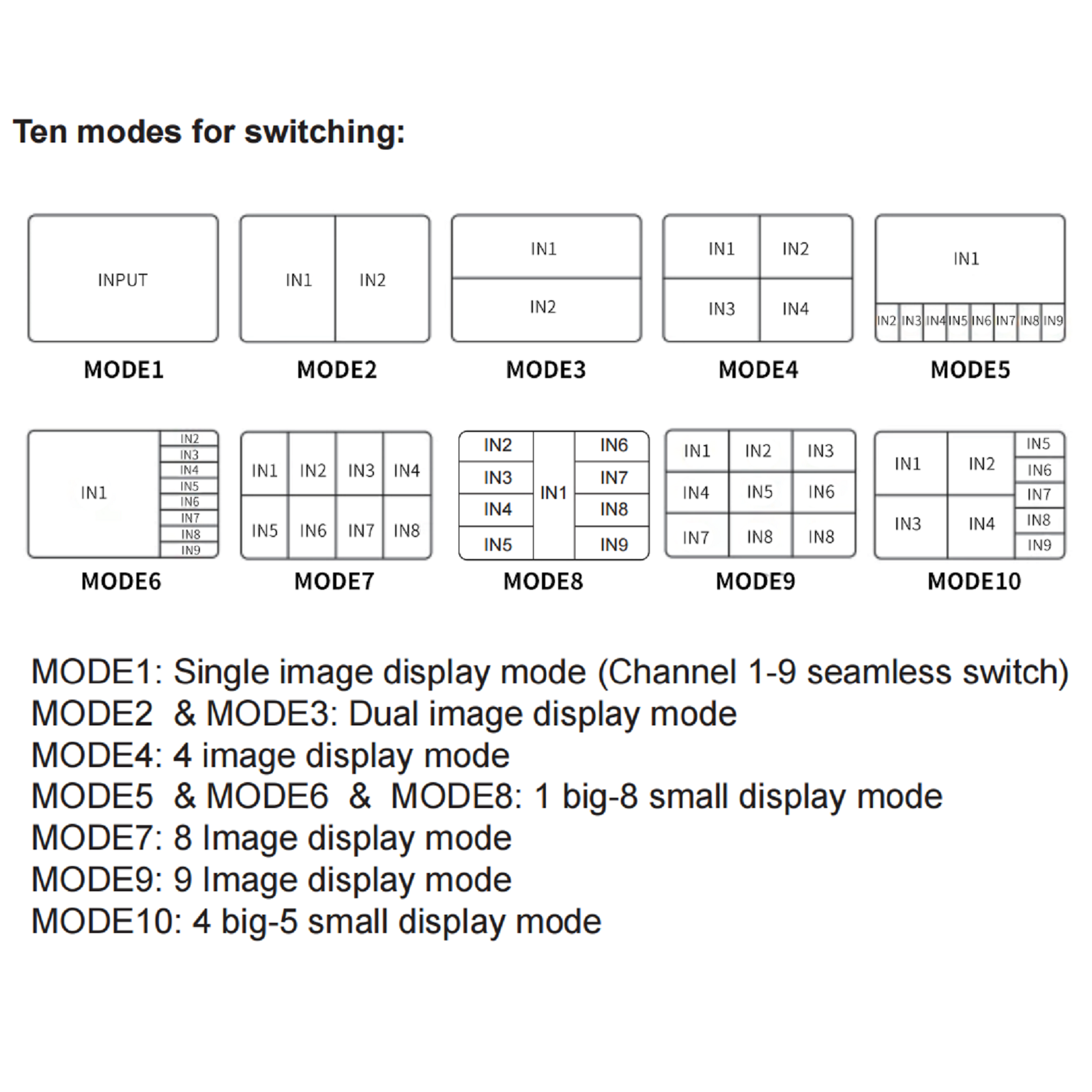 1. 10 Ways Viewing Screen: 9X1 Quad MultiView Selector support 10 viewing modes. You could see 9 HDMI input sources screen on one monitor by 10 ways, also can only see only one HDMI input source by full screen