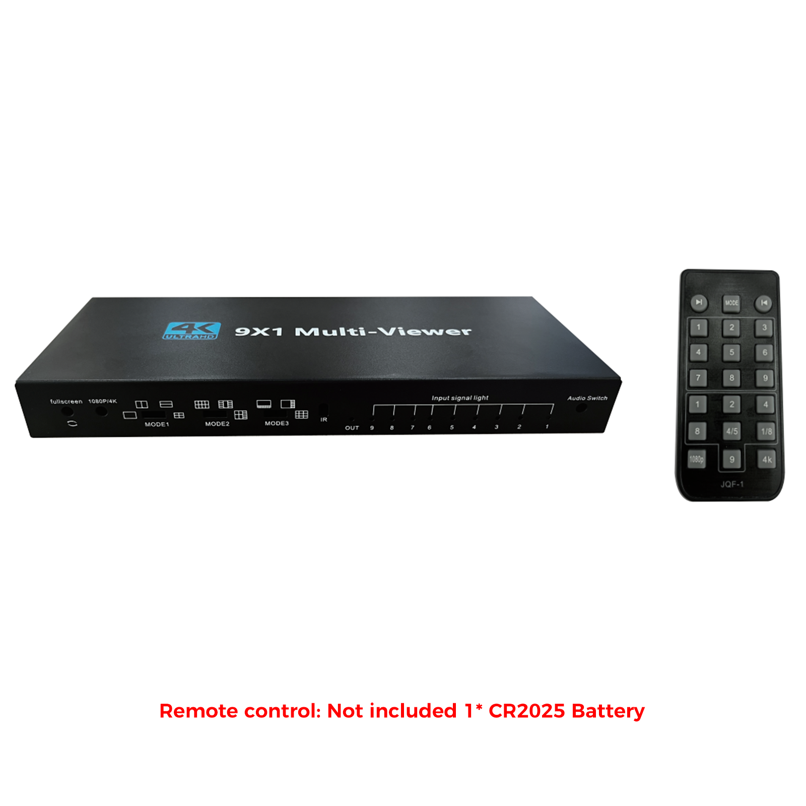 3. Remote Control and Button Control: 9x1 Quad Multi-Viewer with function buttons and attached IR remote control. Manual button and remote control both support switching input source, selecting full screen mode or quad modes and switch input source's audio