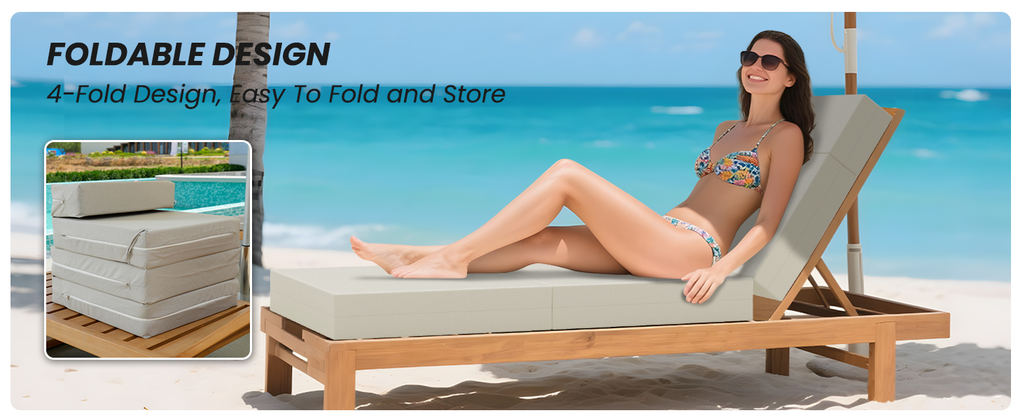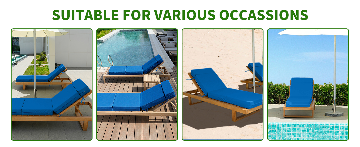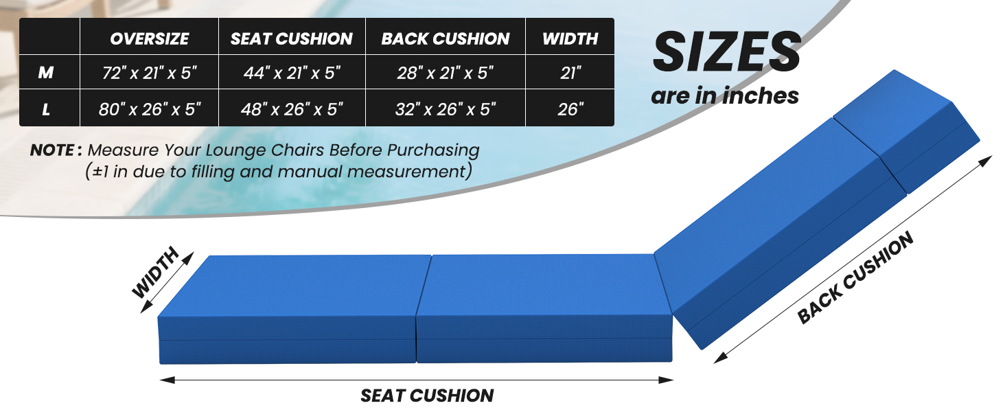 Stylish Colors : Our chaise lounge cushions are available in 2 stylish colors(Beige and Blue) and size 80" x 26" and 5" extra-thick to fit many outdoor chaise lounges. Suitable for your patio, deck, beach, poolside or other outdoor spaces.