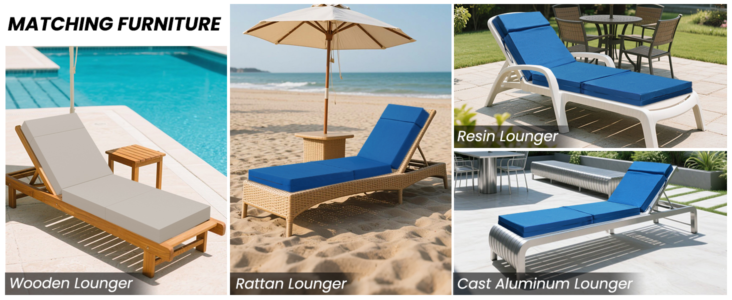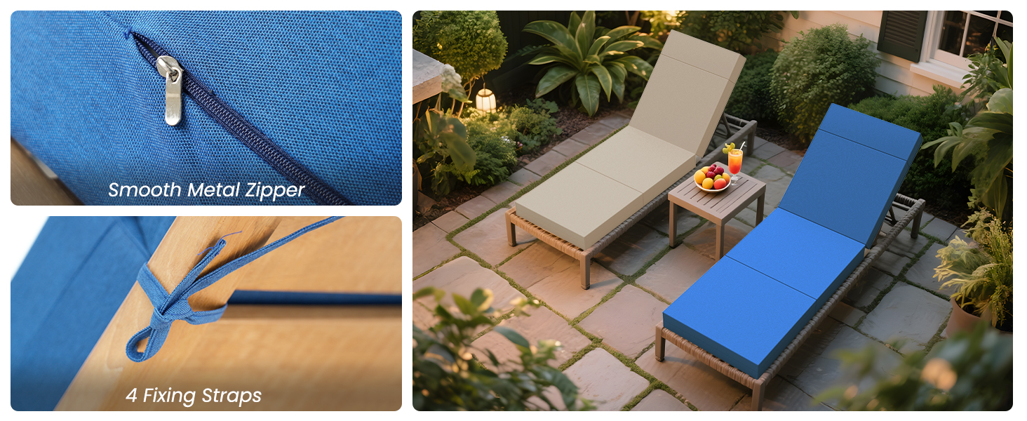 Perfect Fit for Chaise Lounge Chairs: Available in 80" sizes,5" extra-thick, these cushions are designed to fit most chaise lounge chairs. The adjustable tie-down straps ensure they stay securely in place on lawn chairs, poolside loungers, beach sunbed or any chaise lounge chair, adapting to curved or flat surfaces effortlessly